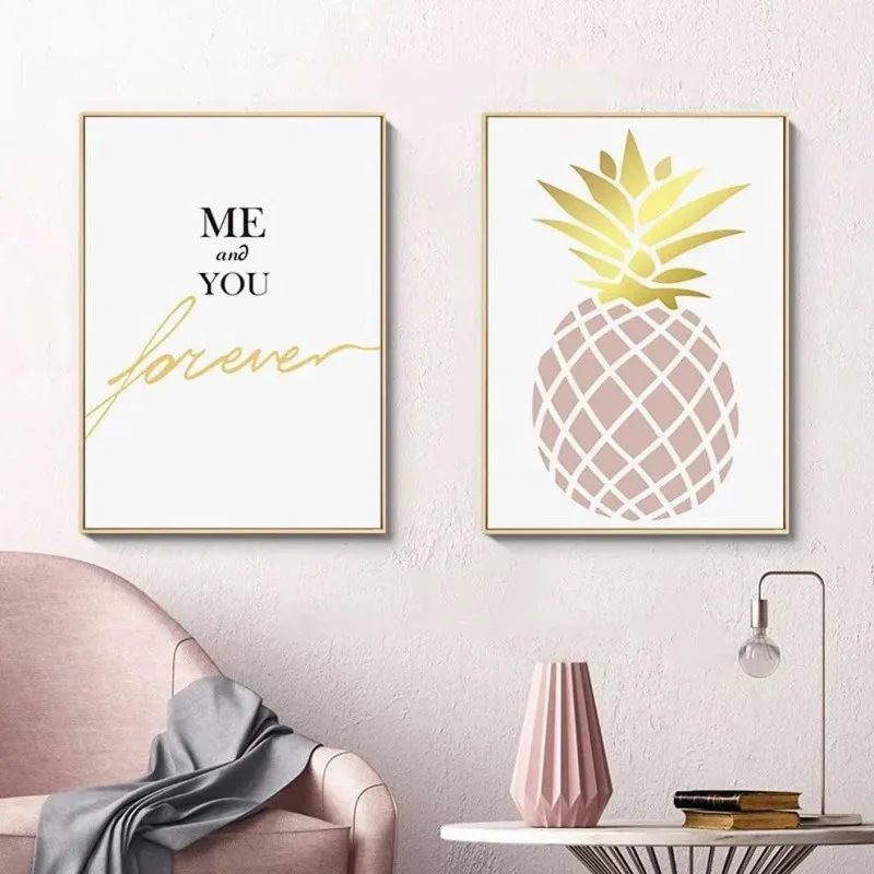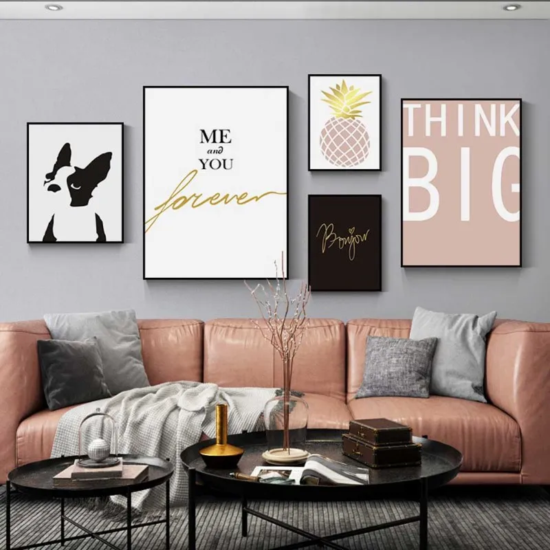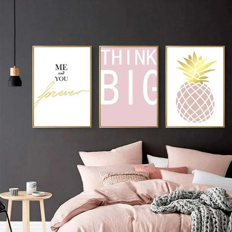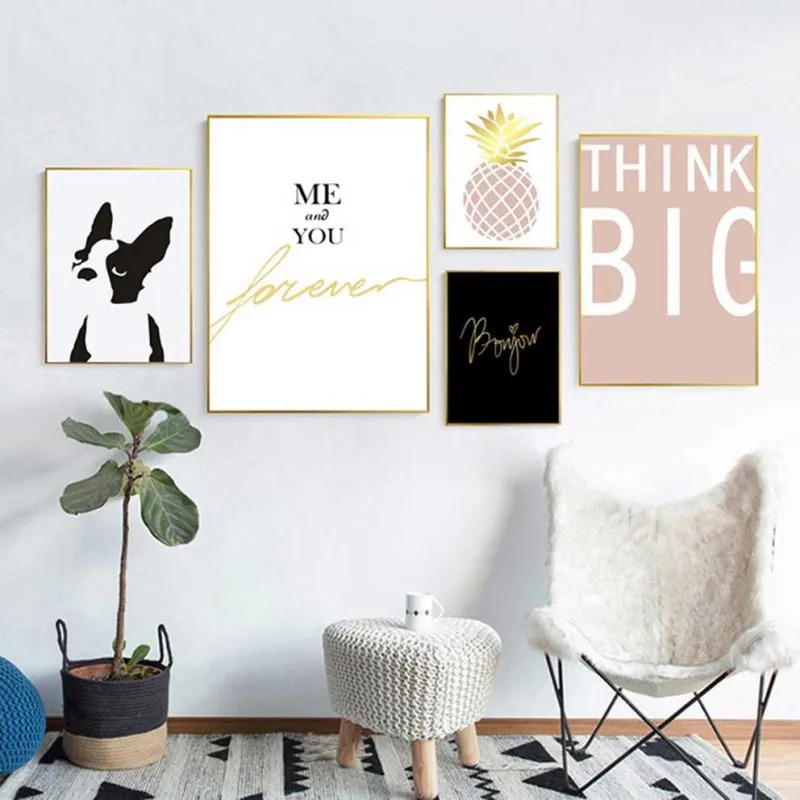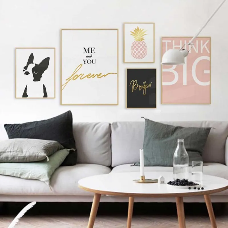 Tranh in canvas Bắc âu Scandinavian chữ, quả dứa và chó french bulldog, trái thơm, kết hơp với chữ, me and you forever, bonjour, think big. Thích hợp treo phòng ngủ, phòng khách, phòng trẻ em, quán cà phê, quán trà sữa…