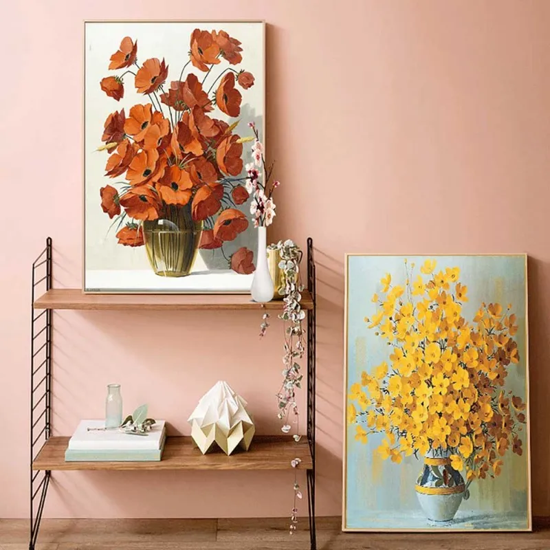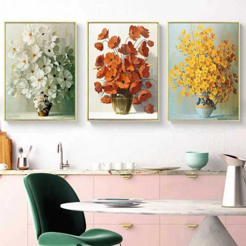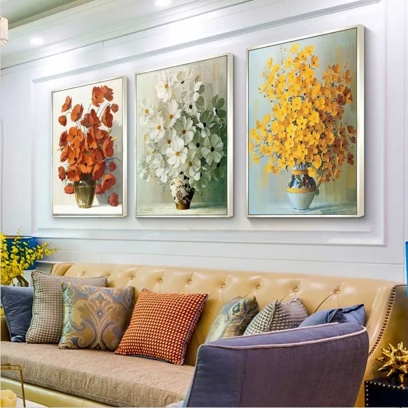 Tranh bộ 3 bình hoa gồm hoa cúc trắng, hoa cam và hoa vàng là những sắc màu rực rỡ giúp cho không gian có cảm giác vui tươi.