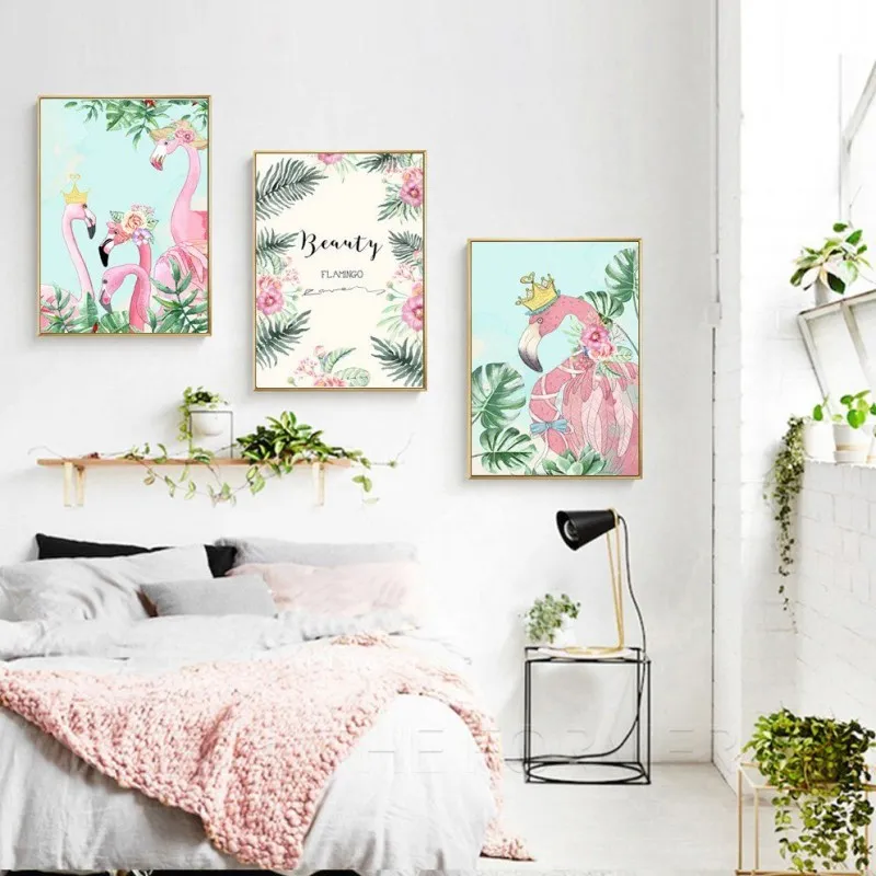 Tranh in canvas chim hồng hạc và lá cây nhiệt đới kết hợp chữ Beauty Flamingo, tranh mang phong cách tươi vui.