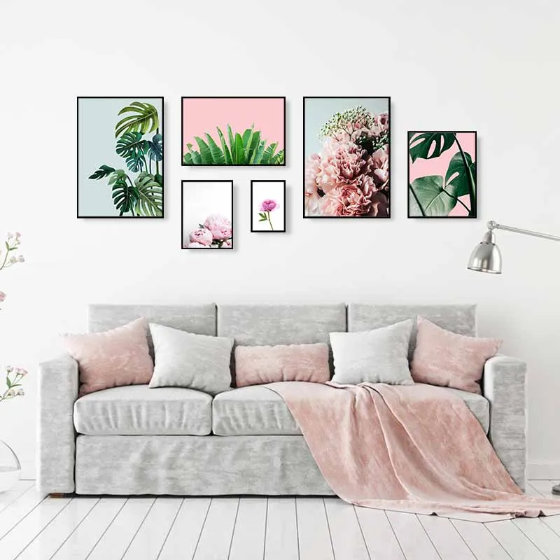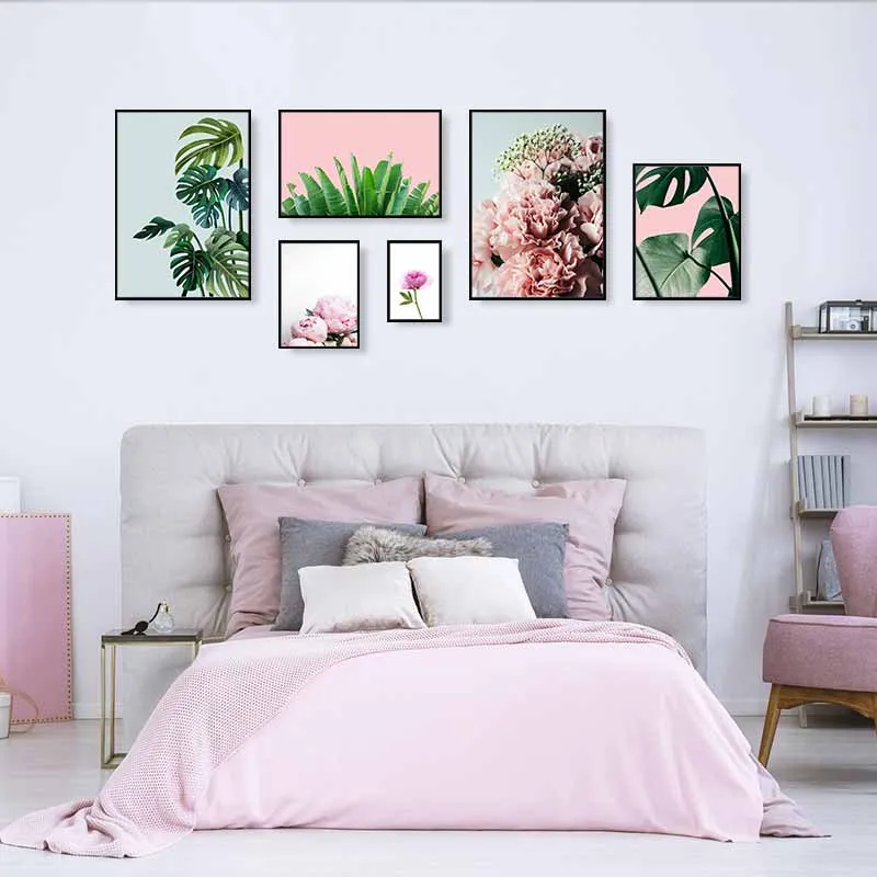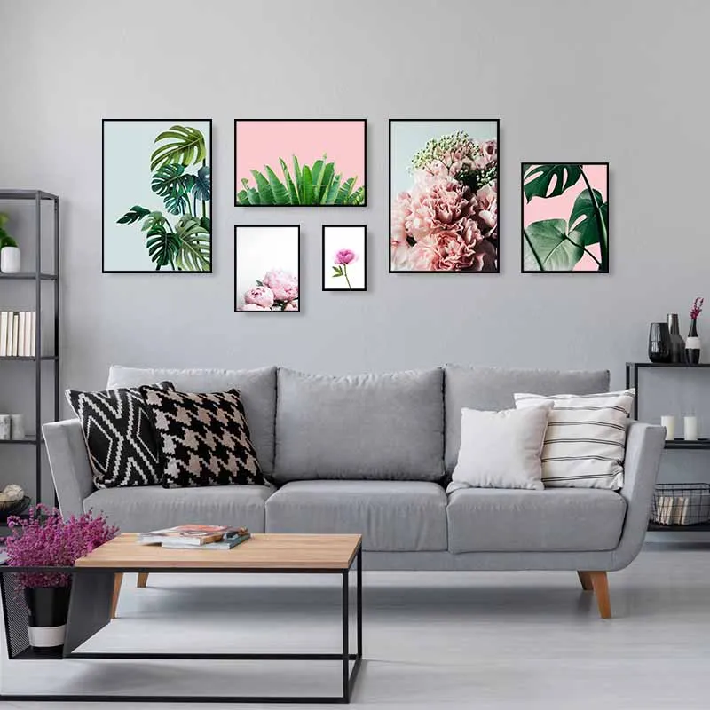 Tranh bộ Scandinavian hoa Mẫu đơn, lá chuối và hoa hồng