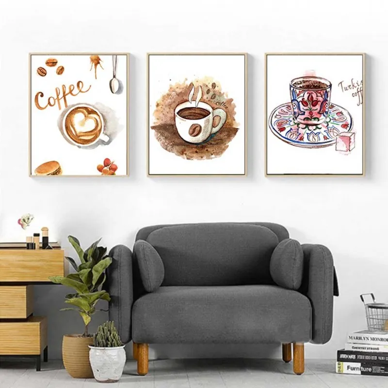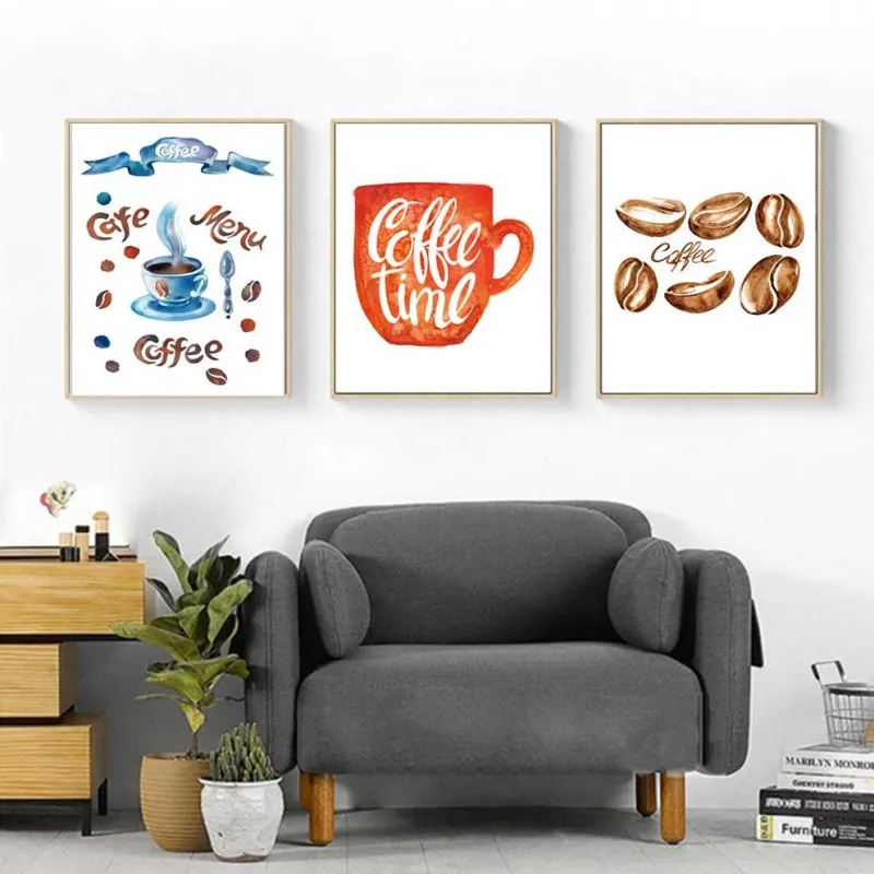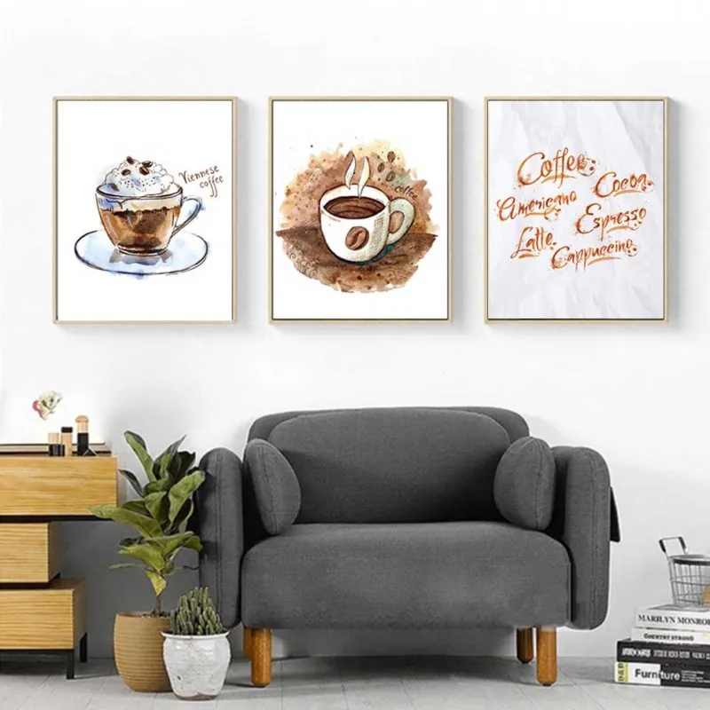 Tranh những ly cà phê, coffee kết hợp chữ hiện đại tên các loại cà phê (Americano, cocoa, latte, espresso, cappuccino) thích hợp treo phòng khách và nhà bếp