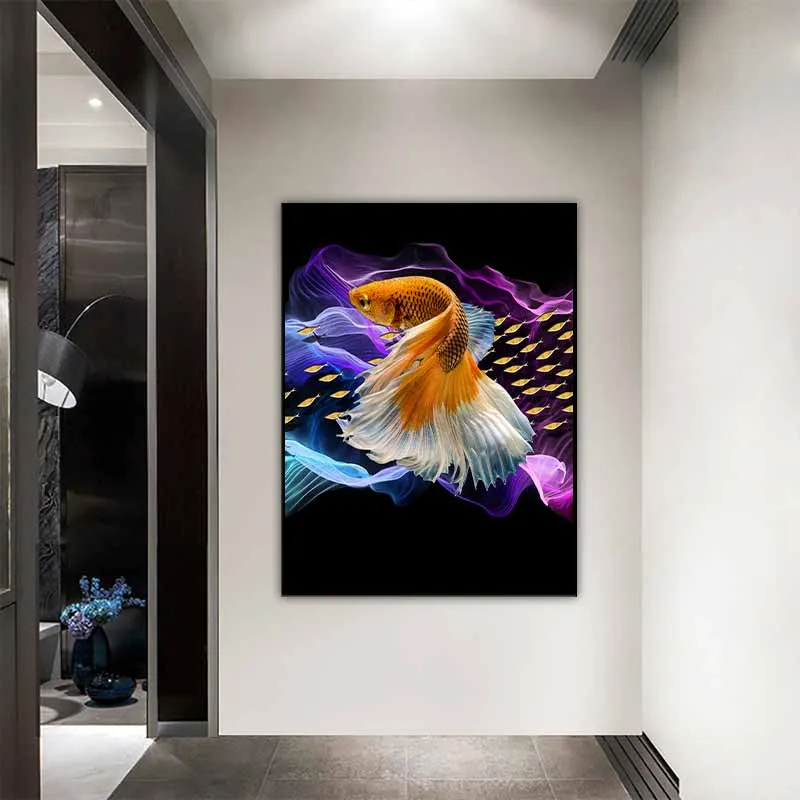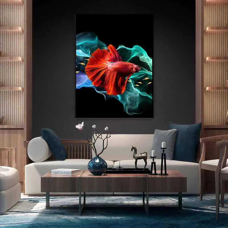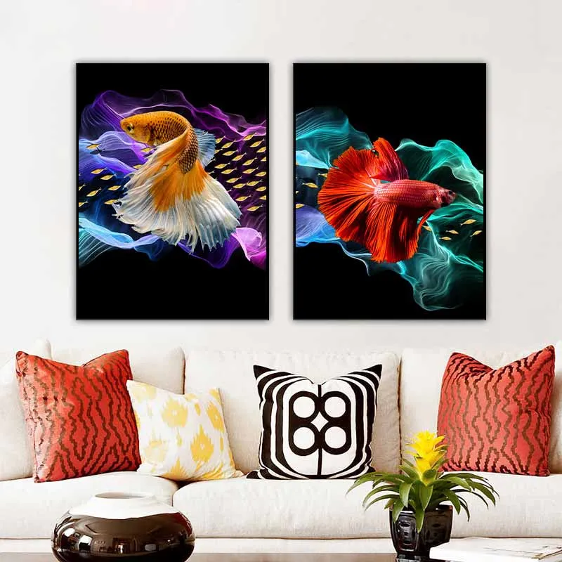 Tranh cá phướng, cá xiêm, cá đá, cá beta màu đỏ, màu vàng và đàn cá nhỏ trừu tượng.