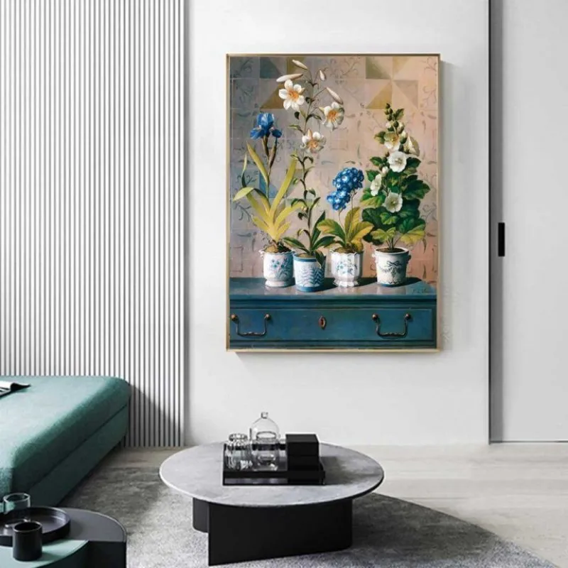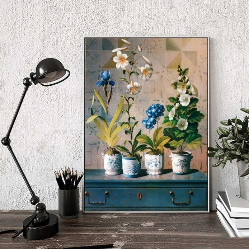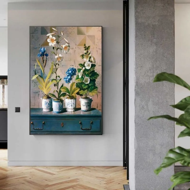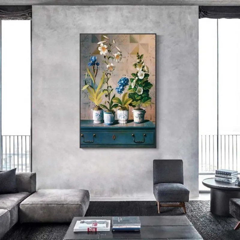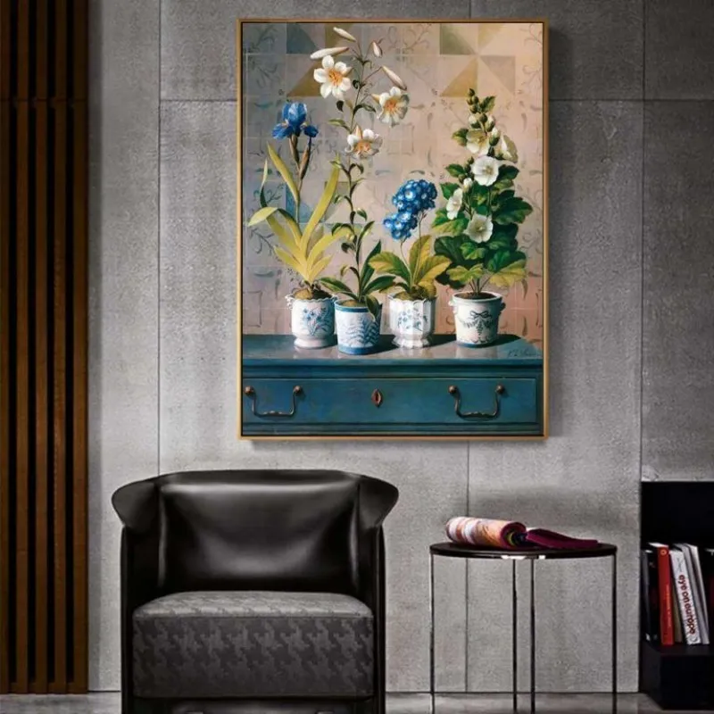 Trang in canvas các loại hoa lan, thiết kế màu trầm ấm mang vẻ cổ điển, thích hợp treo trong nhà có thiết kế nội thất màu nâu tối, với màu xanh biển đậm của bông hoa sẽ là điểm nhấn tuyệt vời cho ngôi nhà