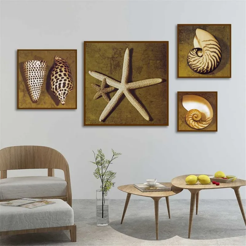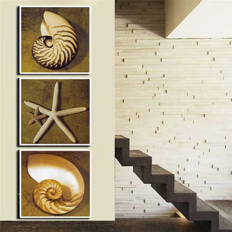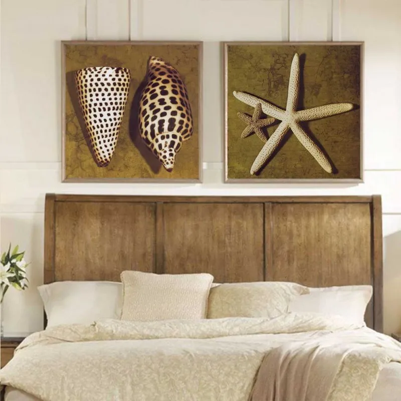Tranh in các loại vỏ ốc và sao biển. Trong bộ tranh này chúng ta có thể cảm nhận được họa tiết của vỏ ốc được bố trí khá đẹp, các chấm nhỏ và to để cạnh nhau như là 1 sự đối lập với nhau. Ngoài ra hình xoắn của vỏ ốc chính là 1 tỷ lệ tuyệt vời mà con người đã khám phá ra, đó chính là tỷ lệ vàng mà hầu như tất cả các nhà thiết kế trên mọi lĩnh vực đều áp dụng. Ngoài ra con sao biển chúng ta cũng có thể dễ dàng nhận ra sự phân bố của nó cũng cực kỳ hoàn hảo. Trong văn phòng công ty hay trong lĩnh vực thiết kế đồ họa, nội thất, tranh vỏ ốc giúp có được nguồn cảm hứng sáng tạo….