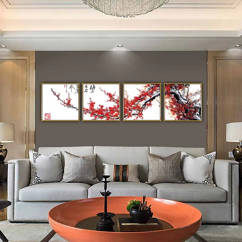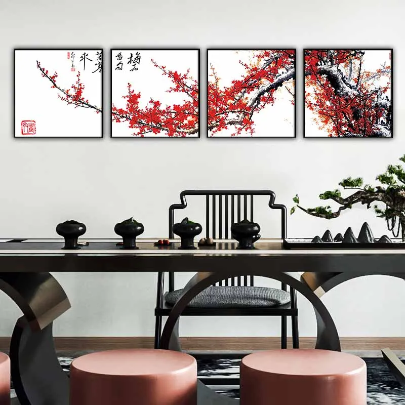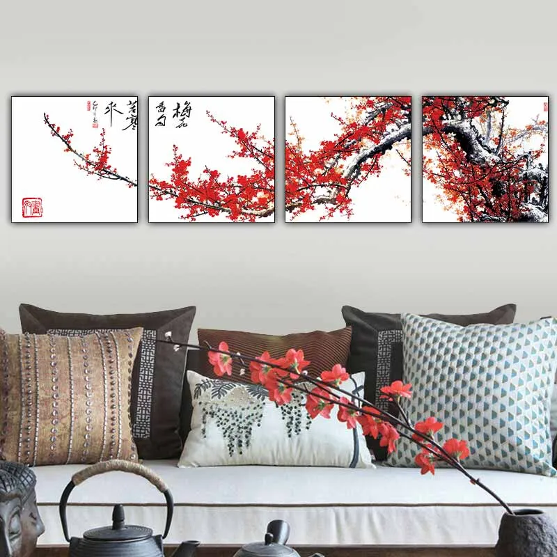 Tranh cành hoa Anh đào đỏ theo phong cách thủy mặc