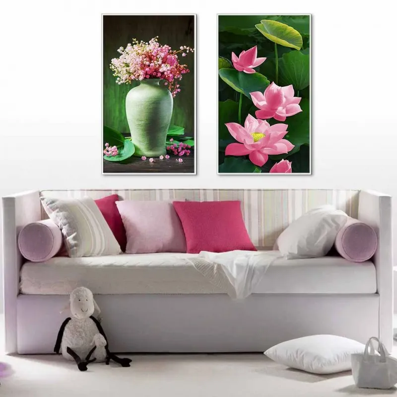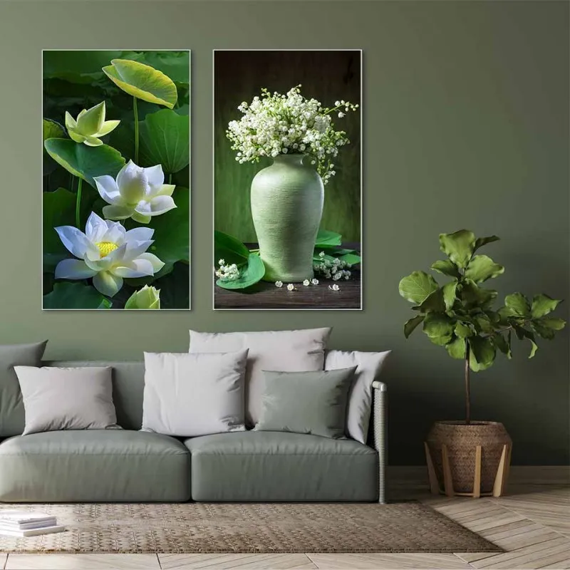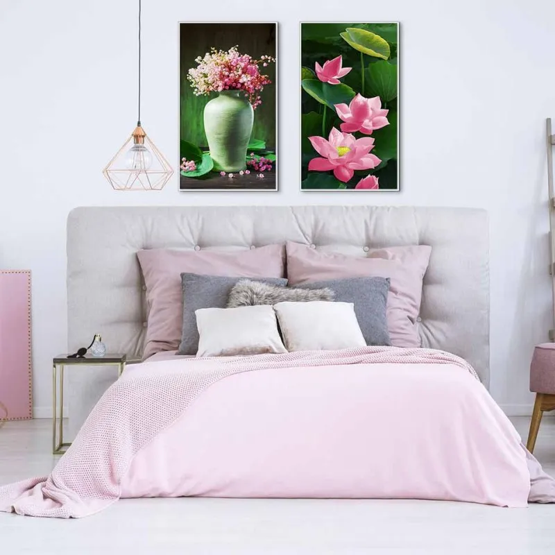 Tranh canvas bình hoa và hoa sen hồng và hoa sen trắng