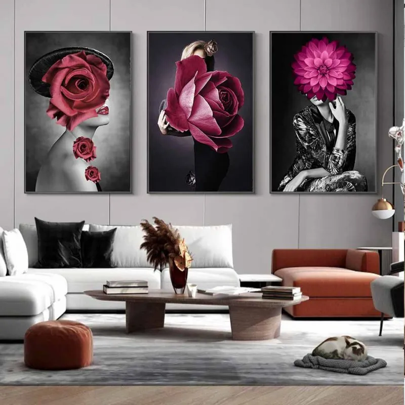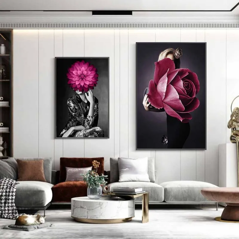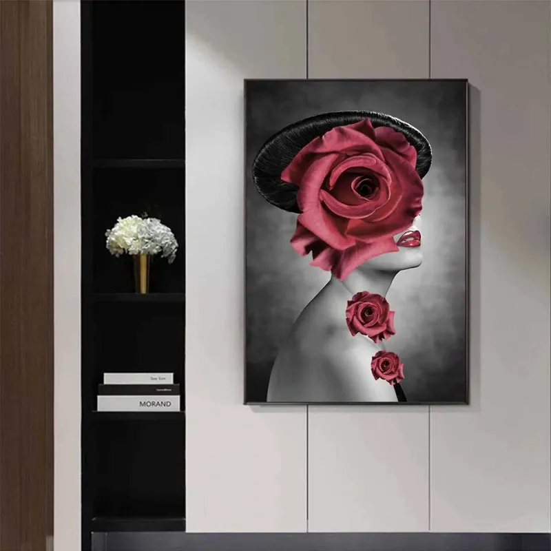Tranh canvas chân dung cô gái và bông hoa hồng che mặt