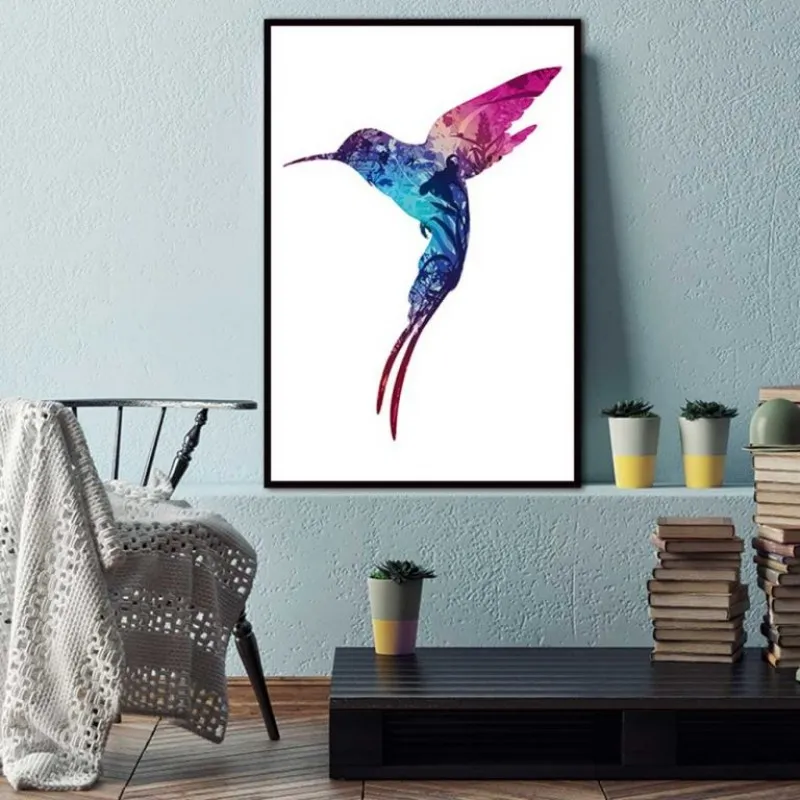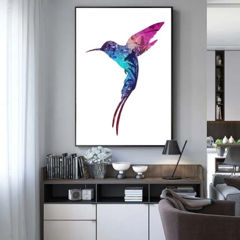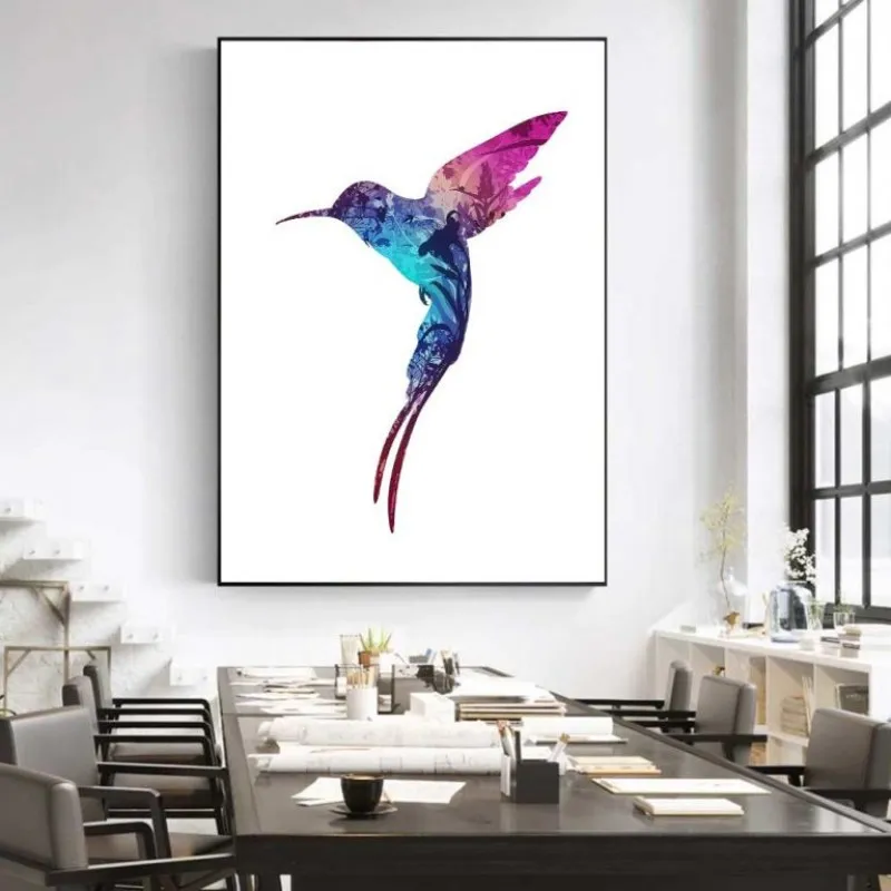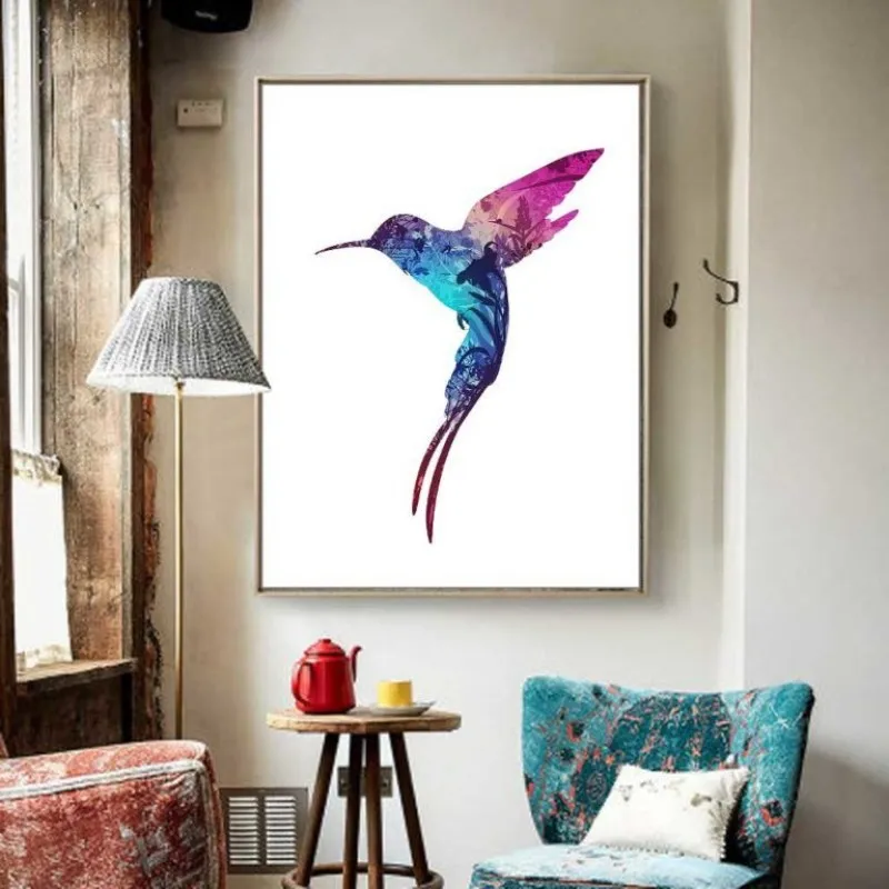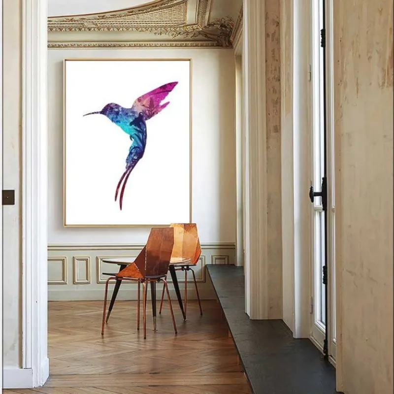 Tranh in canvas chim ruồi hay còn gọi là chim hút mật với hình ảnh của cây cỏ và hoa ẩn bên trong.