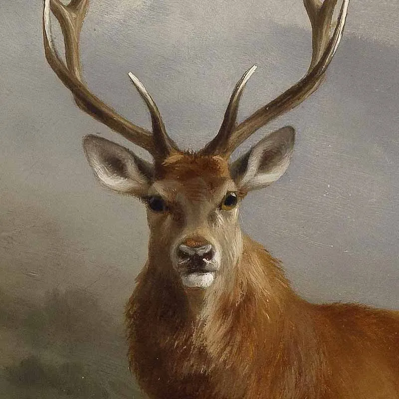 Đây là bản in canvas cao cấp tái hiện lại một tác phẩm kinh điển mang đậm phong cách nghệ thuật Châu Âu thế kỷ 19 của họa sĩ Anton Schmitz (thuộc trường phái Düsseldorf). Bức tranh thu hút ánh nhìn bằng hình ảnh chú hươu đực (stag) uy nghi với cặp sừng lớn tuyệt đẹp đang đứng sừng sững giữa sương mờ, phía sau là bầy hươu cái đang bình yên gặm cỏ. Tác phẩm mang tone màu đất (earth tones) trầm ấm, nét cọ tả thực vô cùng chi tiết từ thảm cỏ, cành lá khô đến lớp lông mượt mà, mang lại một vẻ đẹp hoang dã, quyền quý và phảng phất nét hoài cổ đầy mê hoặc lên chất liệu vải canvas.