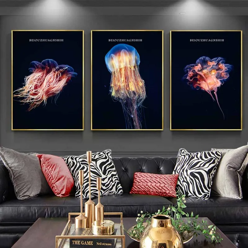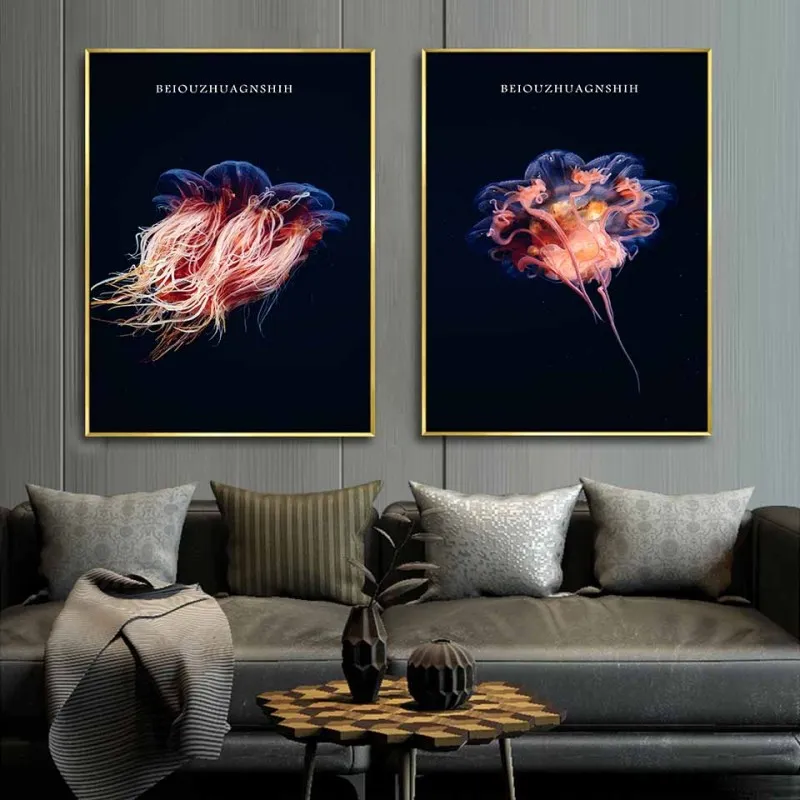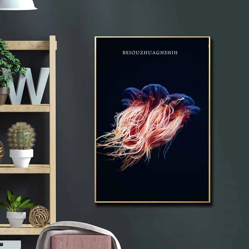 Tranh canvas con sứa trên nền đen kết hợp chữ Beiouzhuagnshih