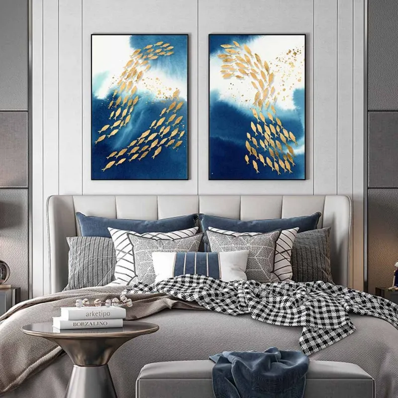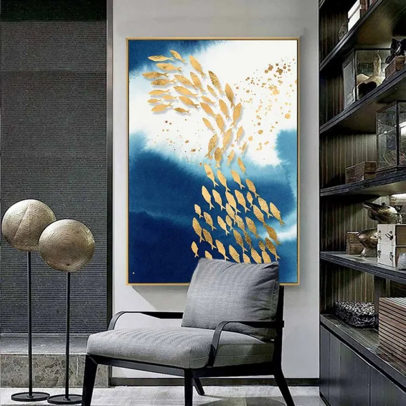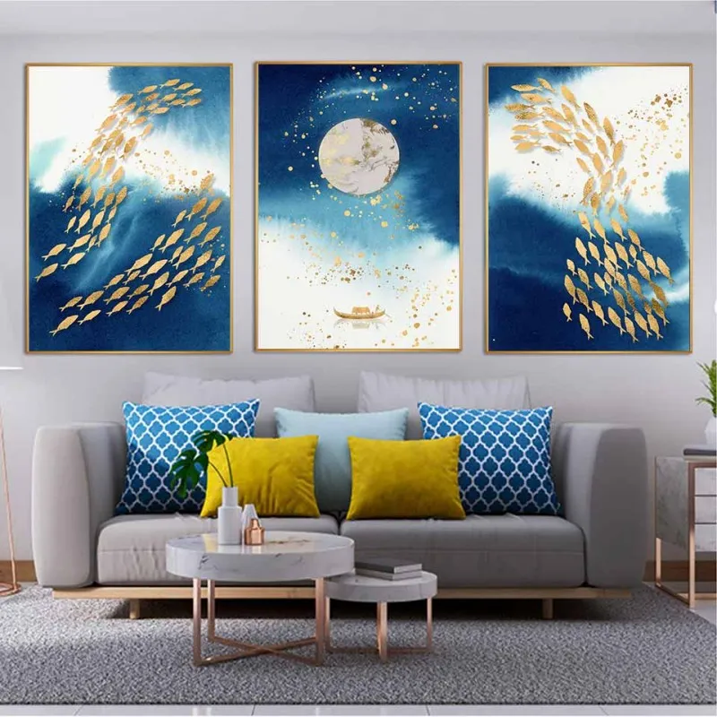 Tranh in canvas trừu tượng đàn cá và phong cảnh chiếc thuyền cùng mặt trăng trên dòng sông.