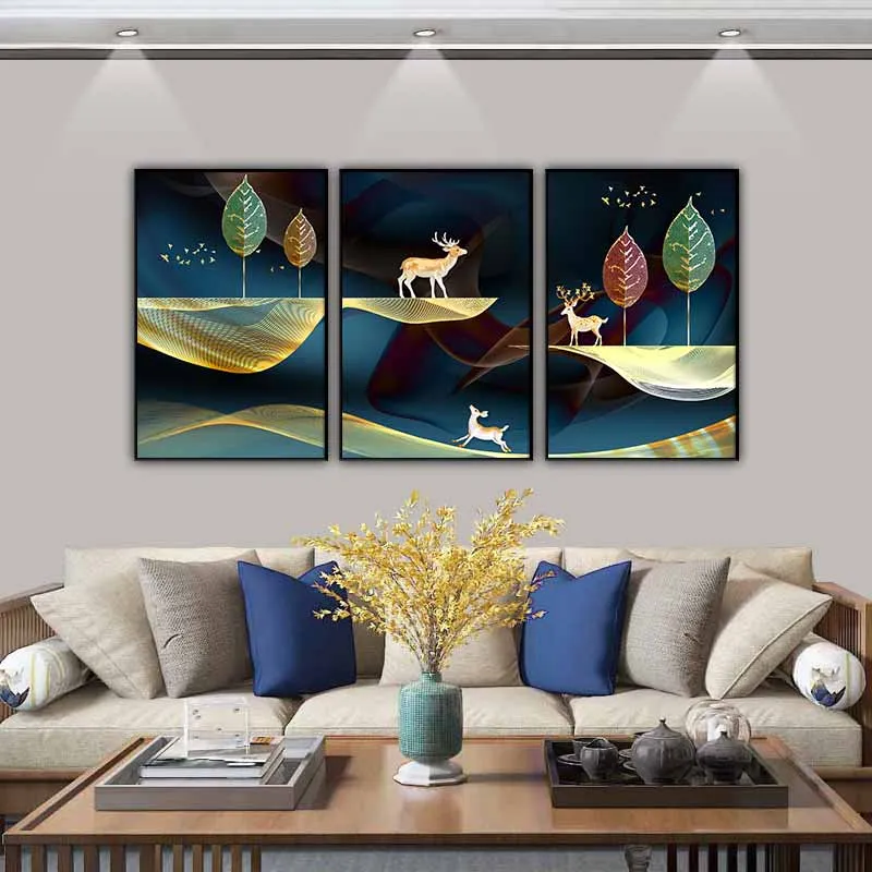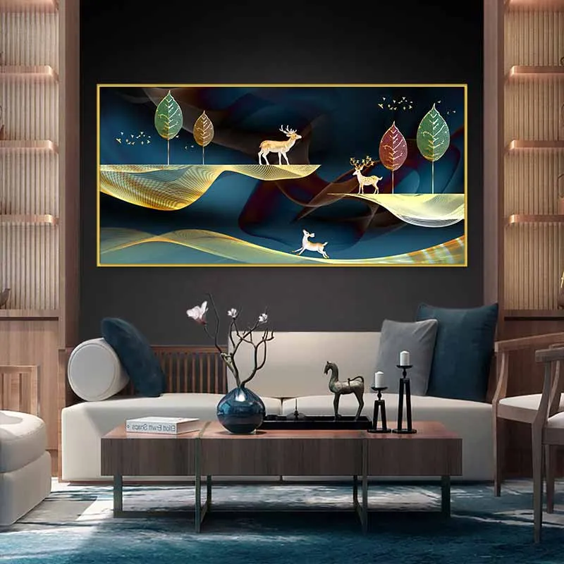 Tranh canvas đàn nai, đàn chim, lá cây và đồi núi trừu tượng