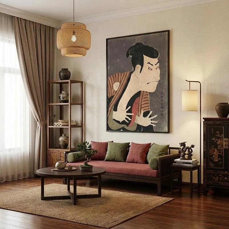 Phong cách Japandi: Sự kết hợp giữa nét mộc mạc của Bắc Âu và sự tinh tế của Nhật Bản. Bức tranh sẽ là điểm nhấn đậm đà trên nền nội thất gỗ sáng màu và tường trắng/be.