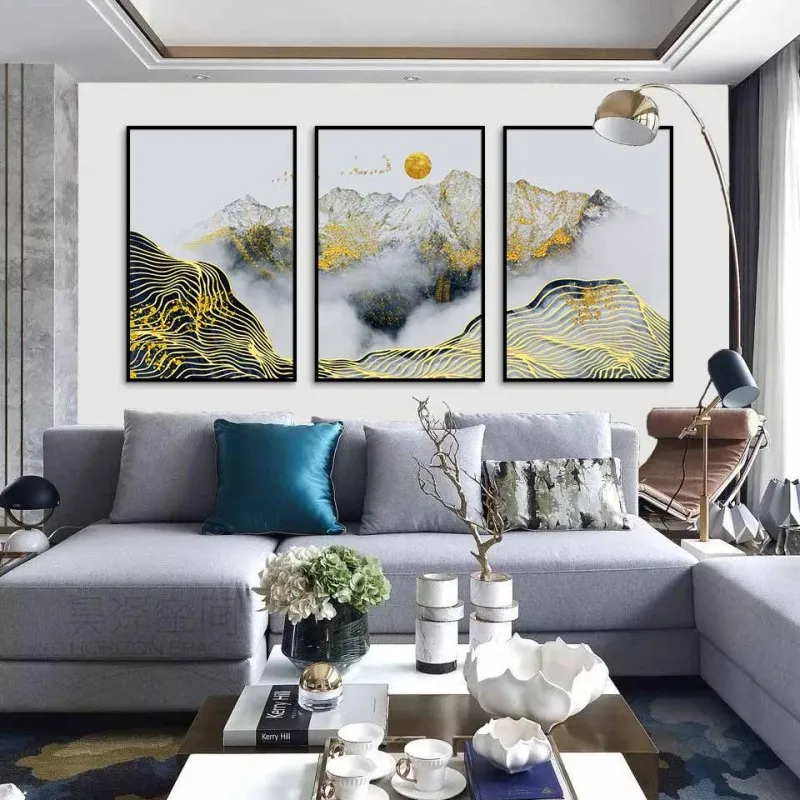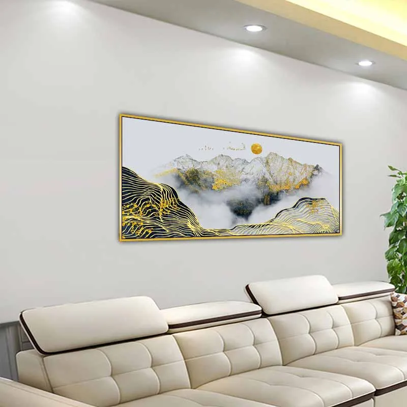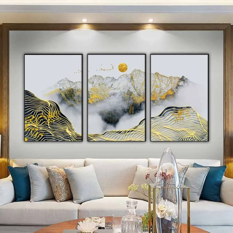 Tranh canvas phong cảnh đồi núi và đàn chim vàng trừu tượng