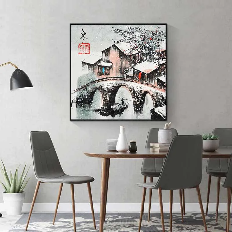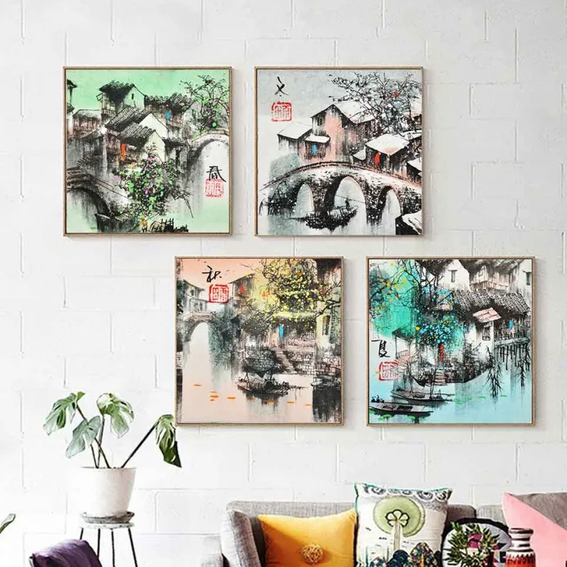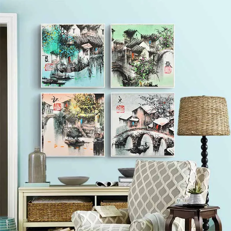 Tranh in canvas phong cảnh 4 mùa Xuân, Hạ, Thu, Đông của một ngôi làng tại Giang Nam, Trung Quốc, tranh được vẽ theo dạng thư pháp.