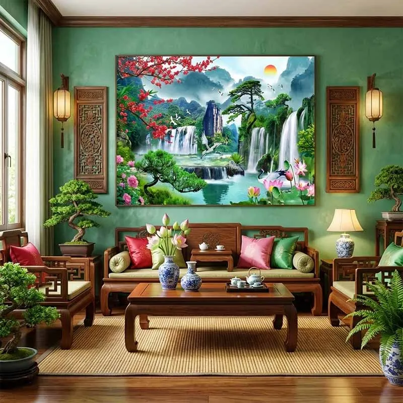 Lý do: Trong phong thủy, "Sơn quản nhân đinh, Thủy quản tài". Bức tranh có cả Núi (sự vững chãi, sức khỏe cho gia chủ) và Nước (dòng tiền, tài lộc chảy vào nhà). Treo bức tranh này tại phòng khách không chỉ tạo điểm nhấn sang trọng, mở rộng không gian nhờ chiều sâu của tranh mà còn giúp điều hòa vượng khí cho cả ngôi nhà.