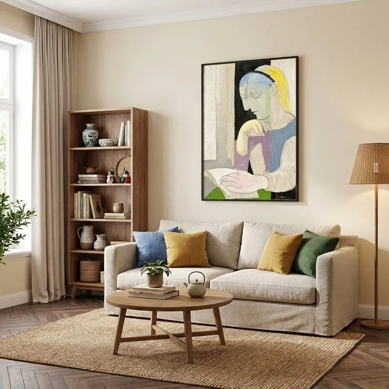 Lý do: Đây là trung tâm của ngôi nhà, nơi bạn tiếp đón khách và sum họp gia đình. Bức tranh "La Lecture" không chỉ là một điểm nhấn thị giác đầy màu sắc mà còn thể hiện gu thẩm mỹ tinh tế và sự am hiểu nghệ thuật của gia chủ. Màu sắc tươi sáng của tranh giúp mở rộng không gian và tạo cảm giác dễ chịu.