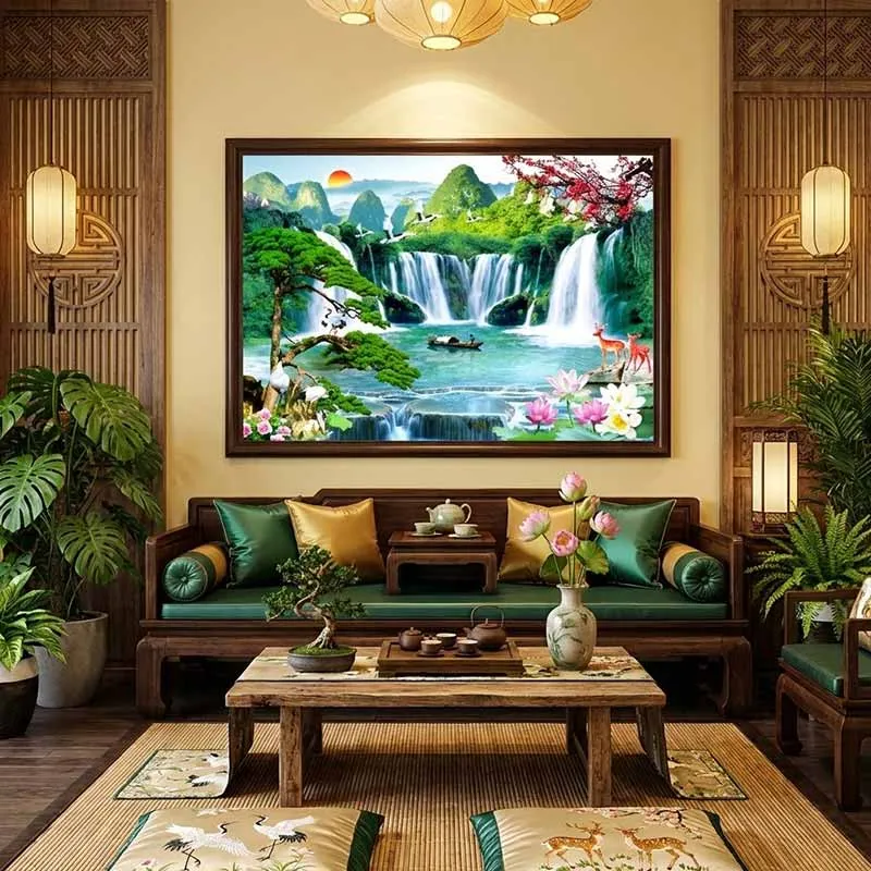 Lý do: Đây là vị trí "đắc địa" nhất trong ngôi nhà để đón nhận vượng khí. Bức tranh có kích thước lớn, cảnh sắc hùng vĩ sẽ tạo điểm nhấn sang trọng cho phòng khách. Theo phong thủy, "Sơn quản nhân đinh, Thủy quản tài", treo tranh này ở phòng khách giúp gia chủ thu hút tài lộc, gia đạo bình an và sức khỏe dồi dào.