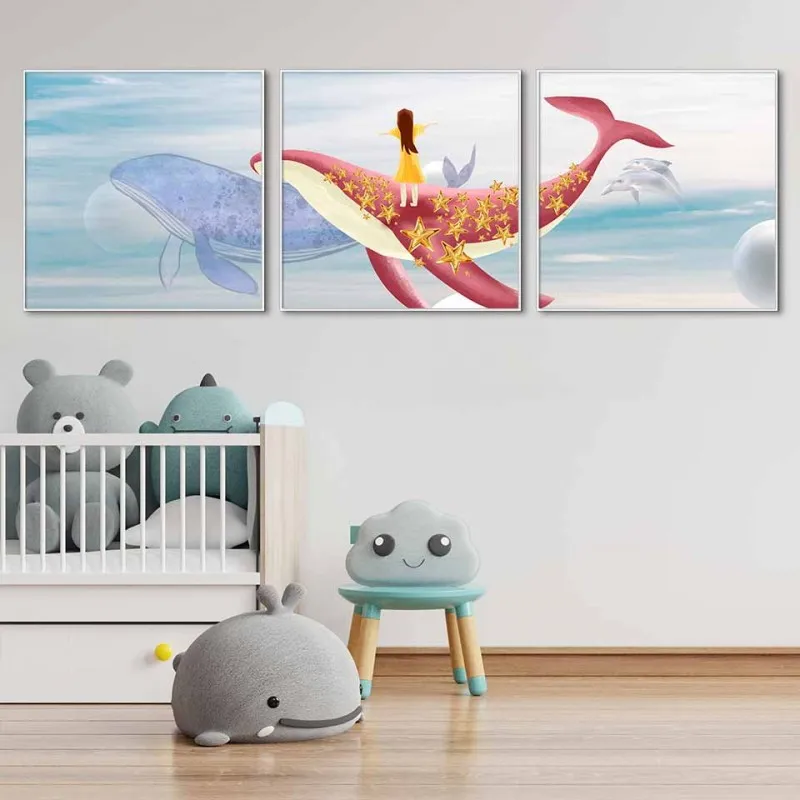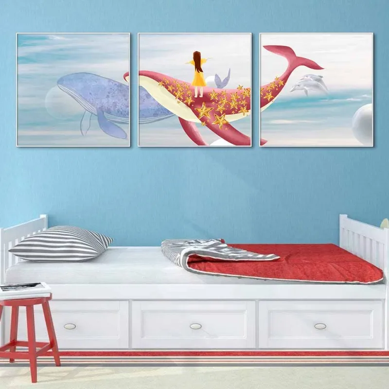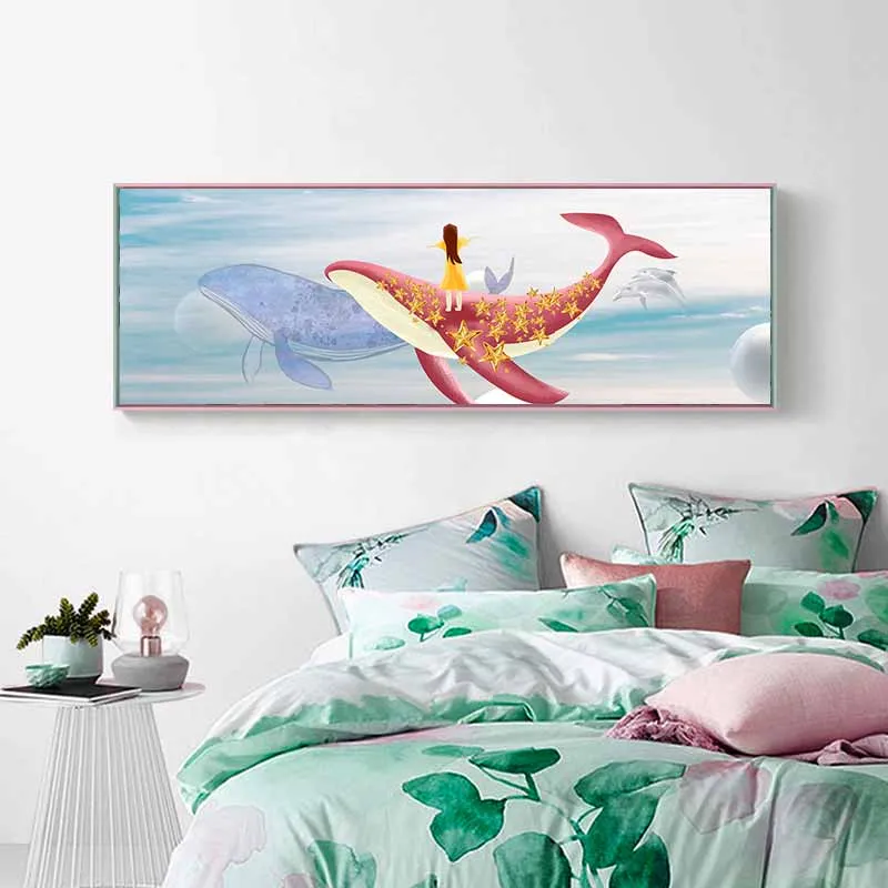 Tranh canvas thần thoại bé gái cưỡi cá voi treo phòng trẻ em