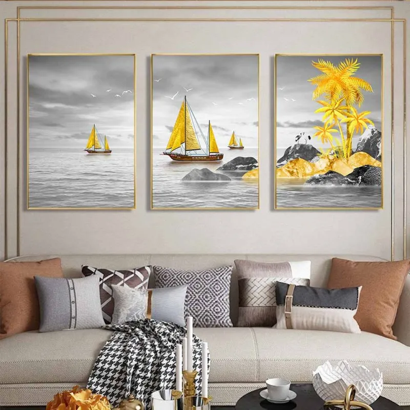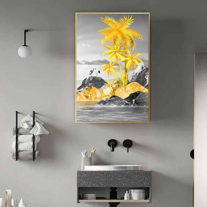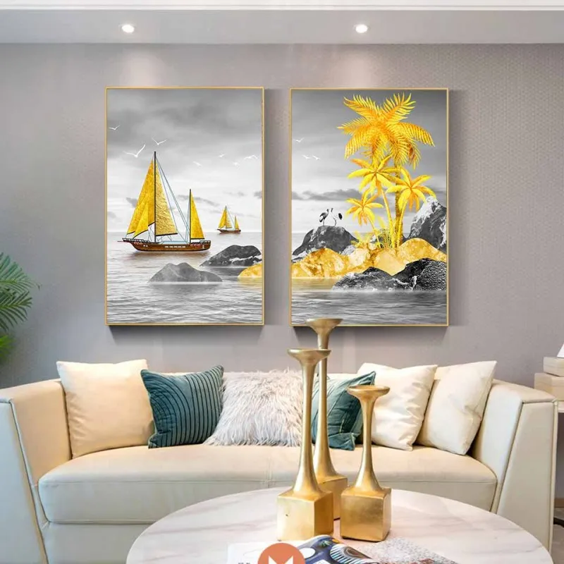 Tranh canvas thuyền buồm vàng, cây dừa vàng trừu tượng và sếu đầu đỏ Nhật Bản