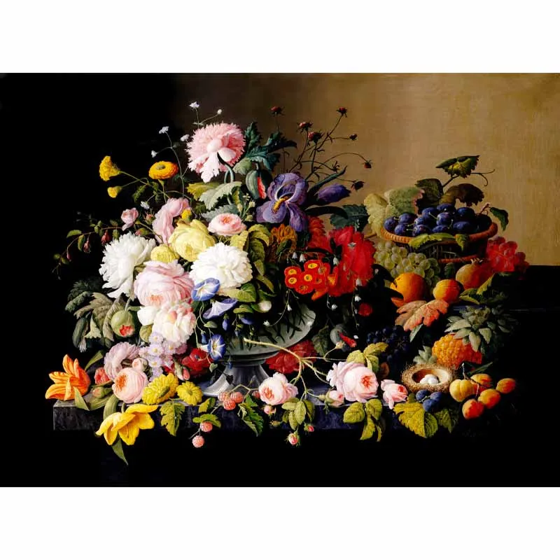 Sự hiện diện của hoa cỏ rực rỡ và các loại trái cây chín mọng từ lâu đã là biểu tượng vĩnh cửu của sự trù phú, no đủ, mùa màng bội thu và thịnh vượng. Treo bức tranh này trong phòng ăn không chỉ tạo ra một không gian dùng bữa vô cùng ấm cúng, sang trọng và đẳng cấp mà còn mang ý nghĩa phong thủy tốt lành, thu hút sự sung túc và tài lộc cho gia chủ.