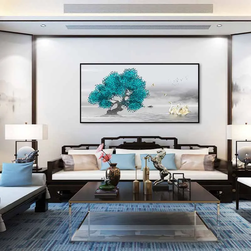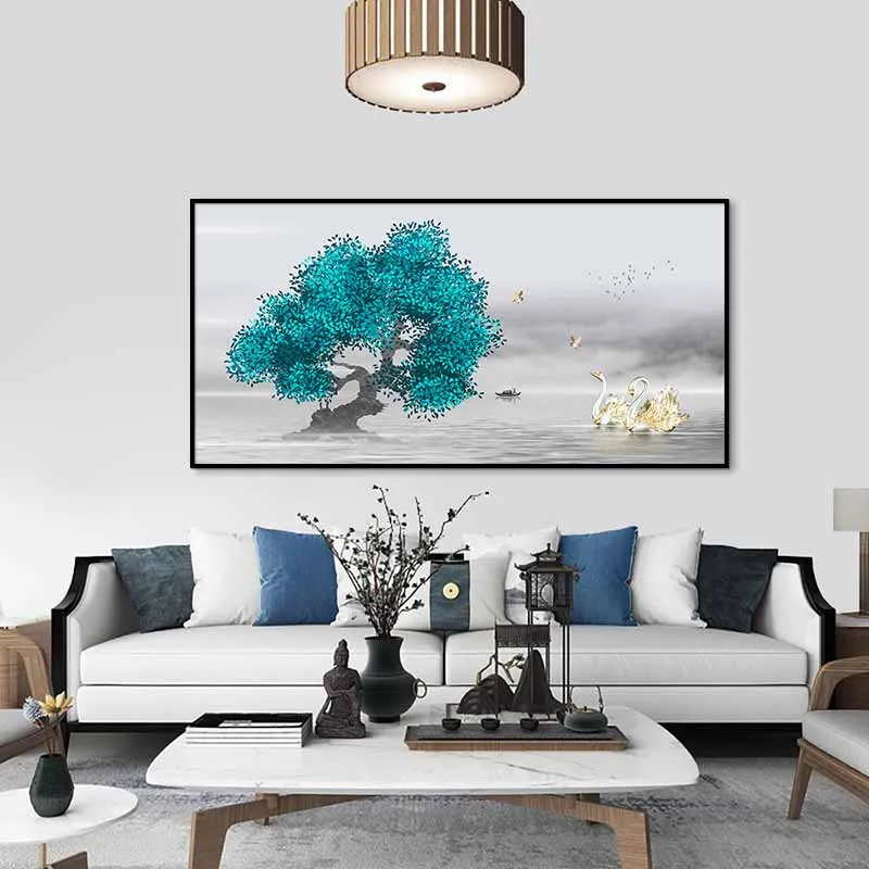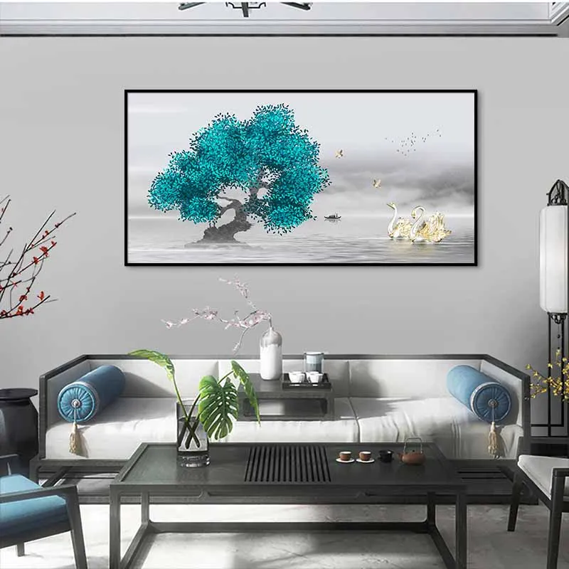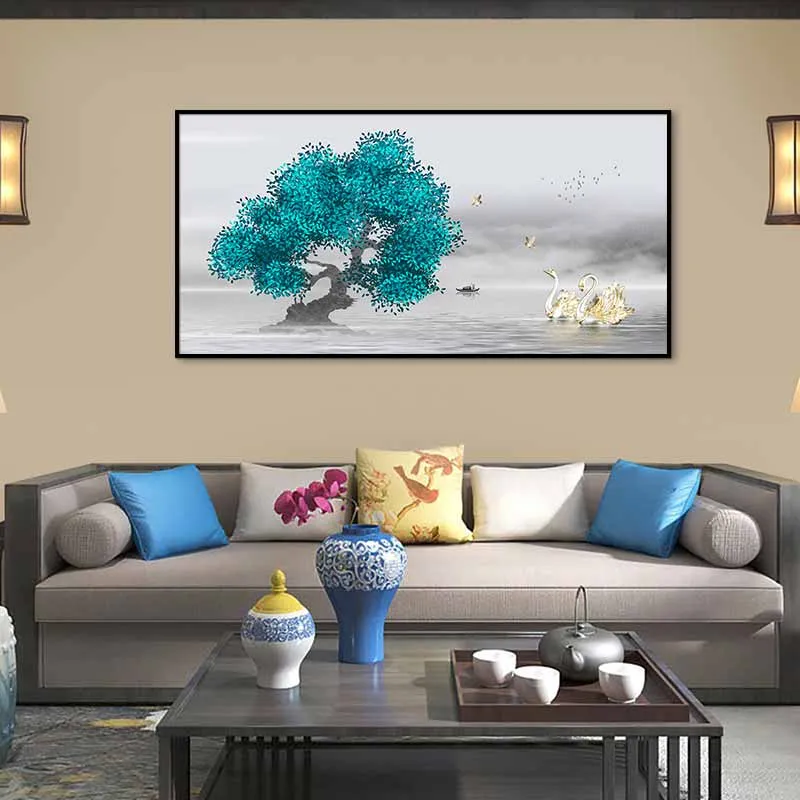 Tranh canvas trừu tượng cây xanh và đôi thiên nga bạc khổ ngang