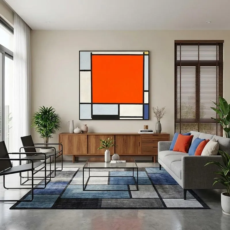 Tại sao bức tranh này lại phù hợp? Phong cách Mondrian biểu trưng cho sự trật tự và cân bằng. Trong Phòng khách, nó thể hiện gu thẩm mỹ tinh tế và hiện đại của gia chủ. Trong Văn phòng, sự dứt khoát của các đường kẻ đen giúp tinh thần tập trung, giảm bớt sự xao nhãng nhưng vẫn không làm không gian trở nên đơn điệu nhờ các mảng màu nguyên bản.