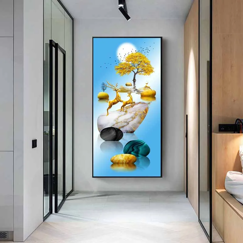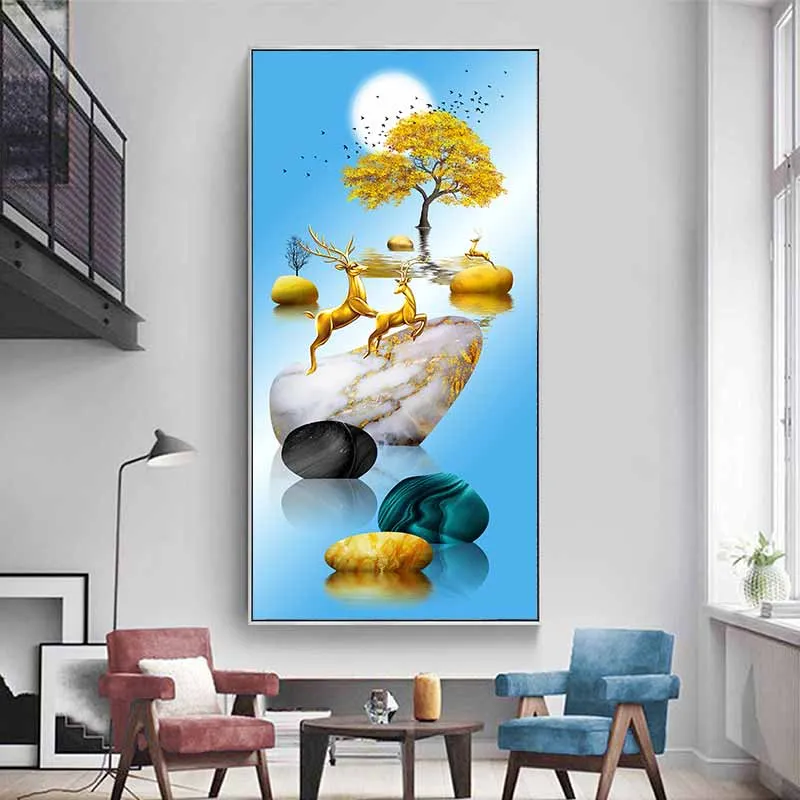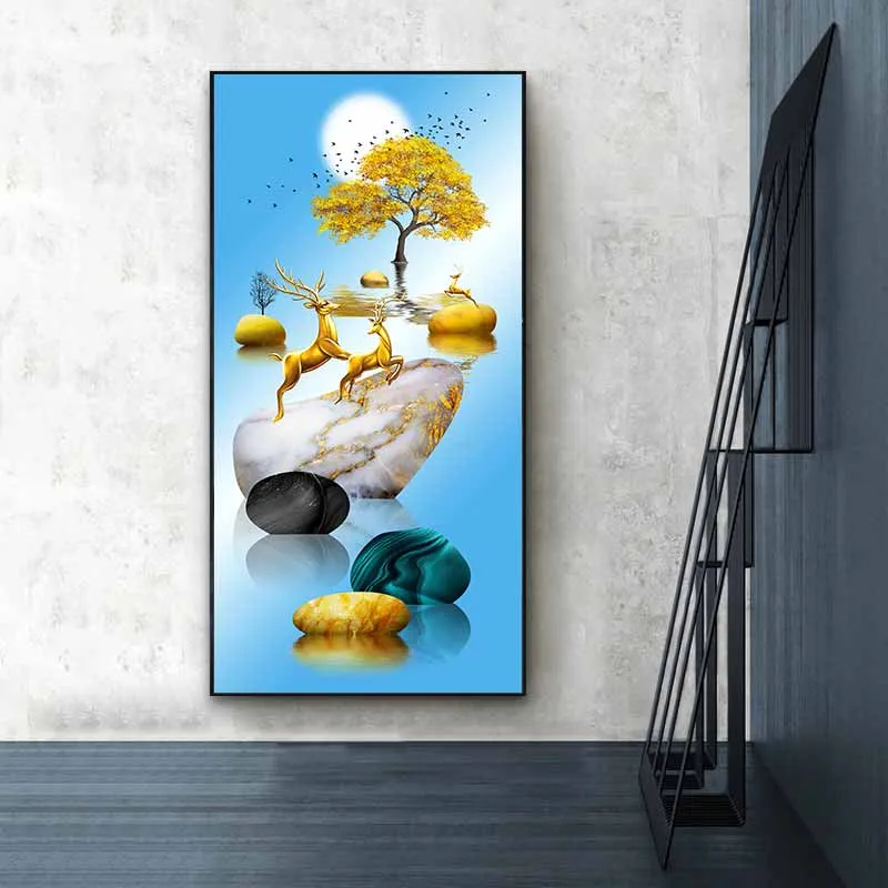 Tranh cây lá vàng và hai con nai vàng chạy nhảy trên những tảng đá phong thủy