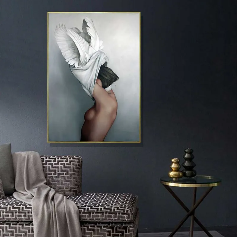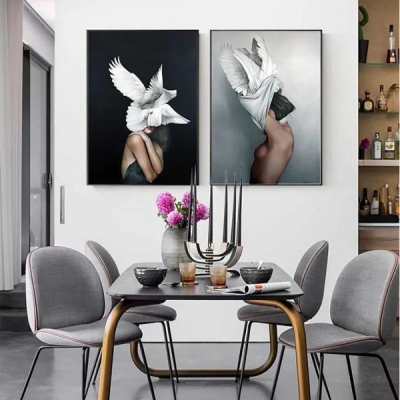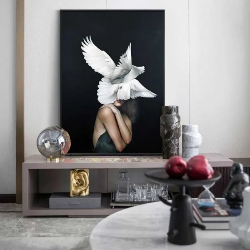 Tranh chân dung cô gái khỏa thân và những con chim bồ câu thay thế như là một chiếc mũ lông trông rất ấn tượng, tranh có những sắc màu sáng tối rõ ràng rất phù hợp với căn nhà có thiết kế hiện đại đơn giản với các sắc đen trắng làm tôn vinh lên vẻ đẹp và sự sang trọng cho căn nhà.