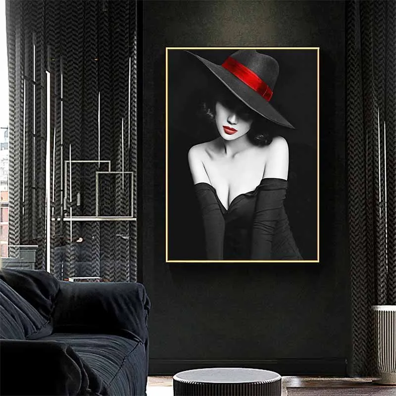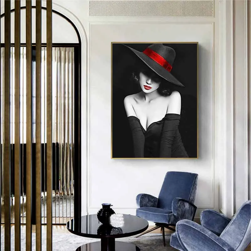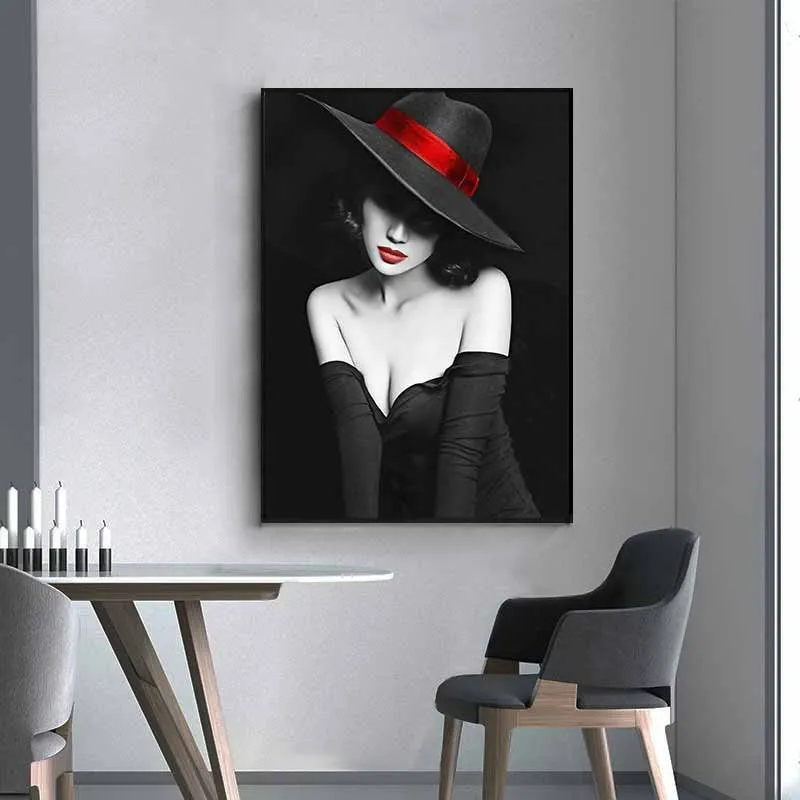 Tranh chân dung cô gái đen trắng đội mũ viền đỏ