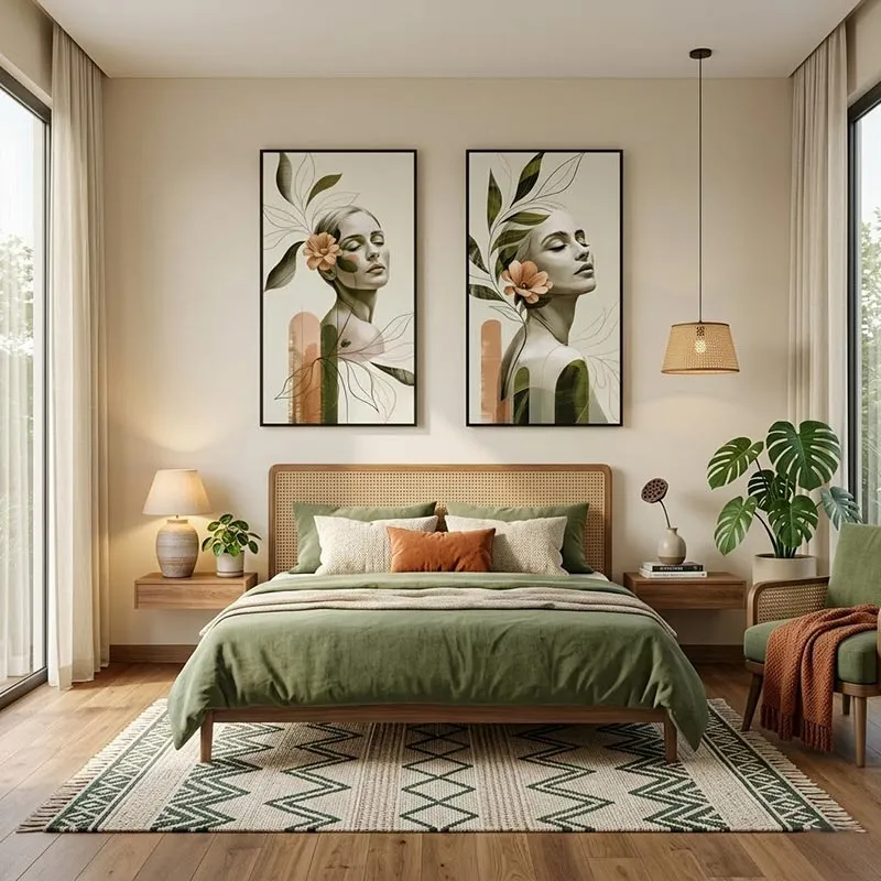 Không gian Modern Bohemian (Boho hiện đại): Sự kết hợp của tone màu đất, lá cây và nghệ thuật trừu tượng rất "match" với những món đồ mây tre đan, thảm macrame đặc trưng của phong cách Boho.