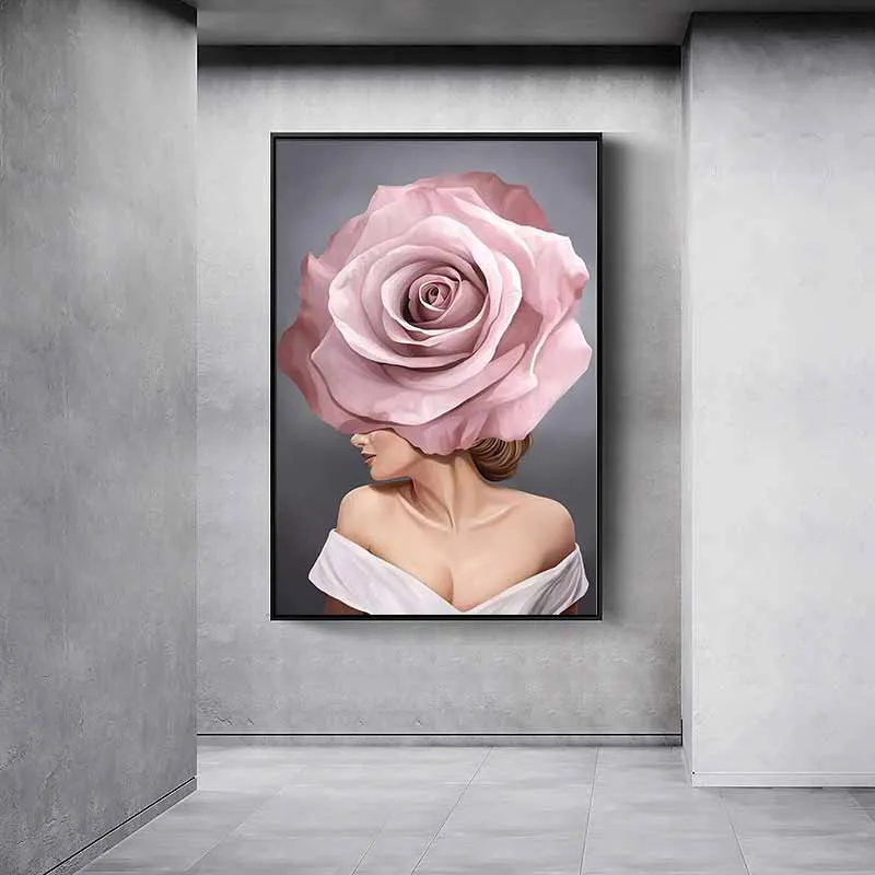 Tranh chân dung cô gái và hoa hồng lớn che khuôn mặt