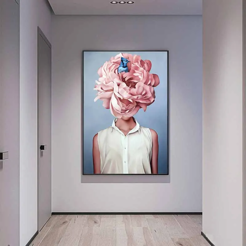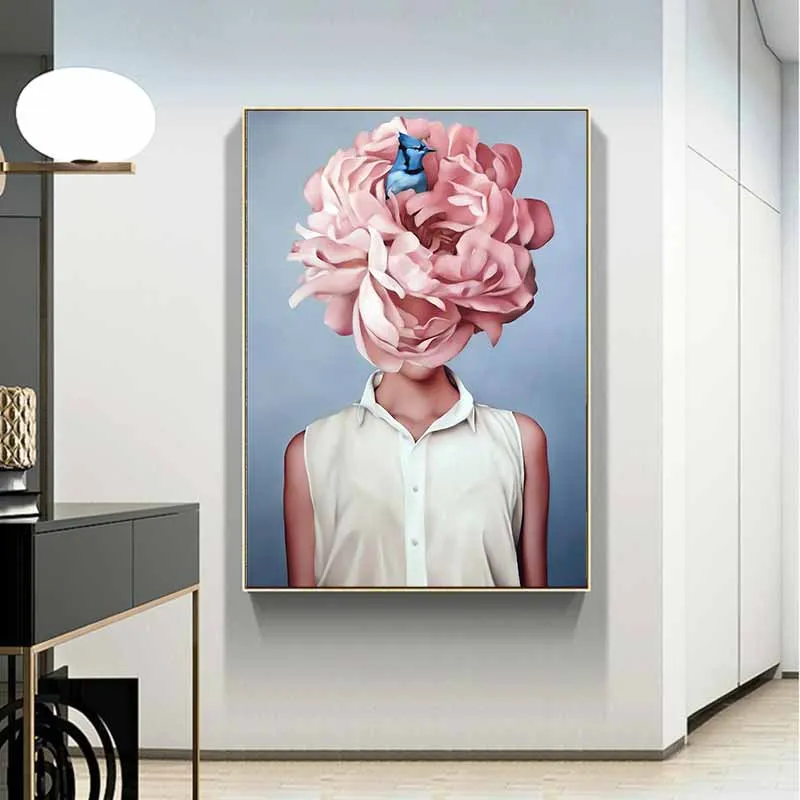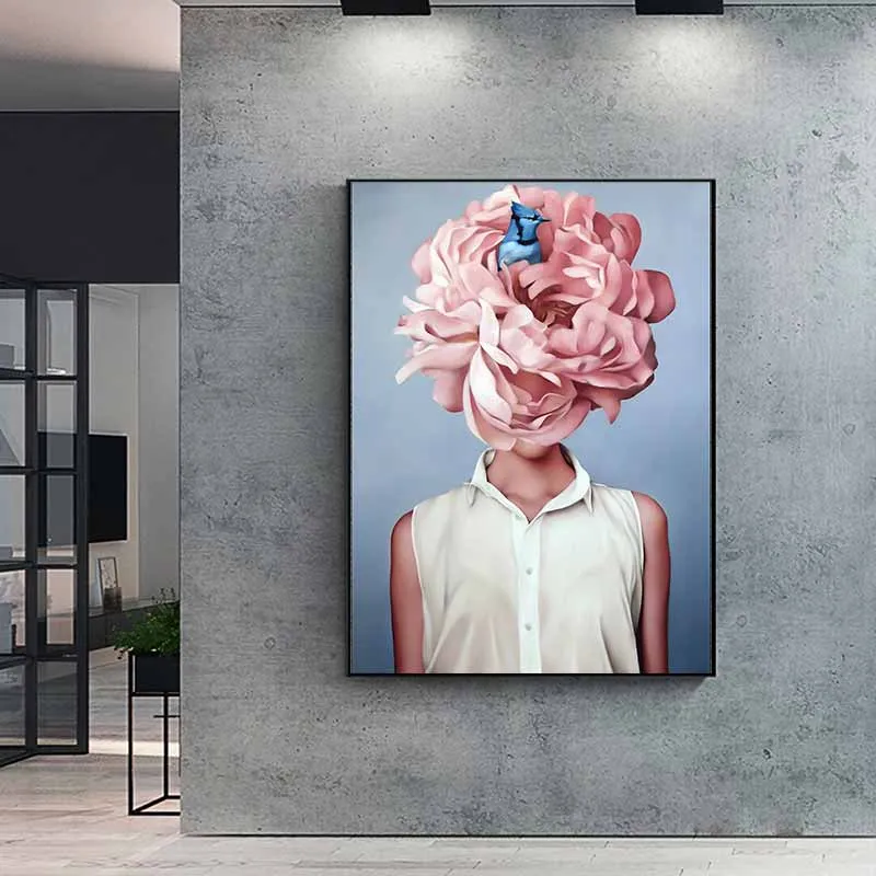 Tranh chân dung cô gái với hoa mẫu đơn và chim màu xanh