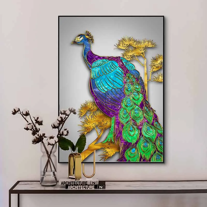 Tranh chim công cách điệu đứng trên cành cây màu vàng kim