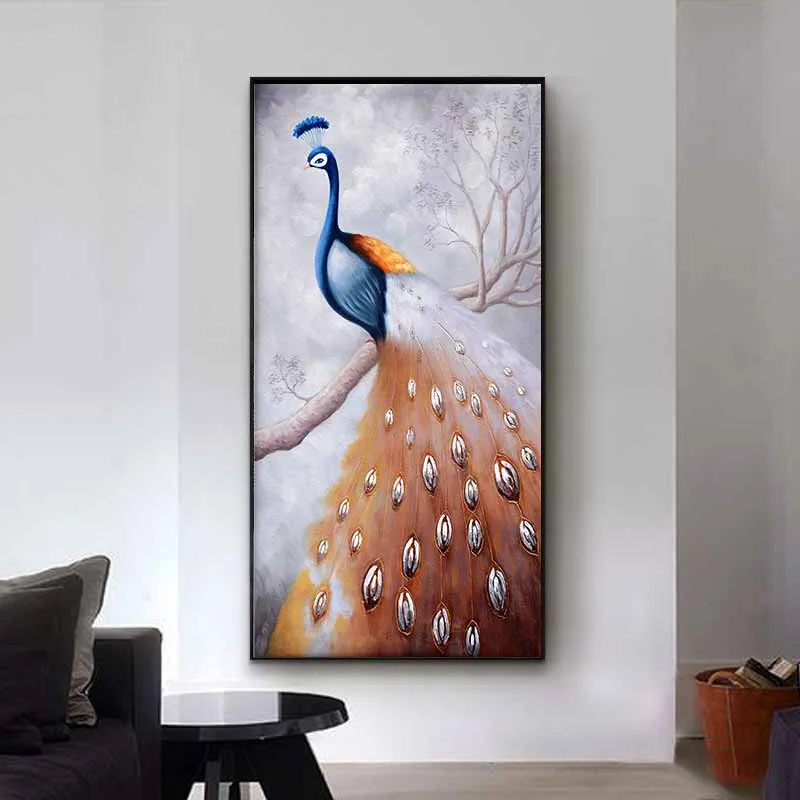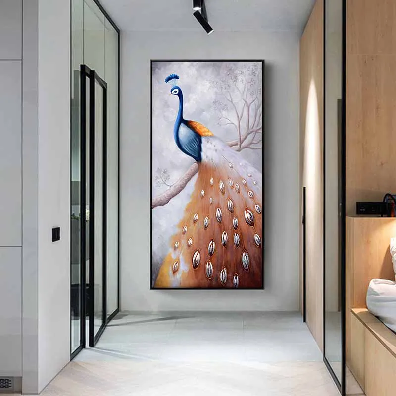 Tranh chim công xanh đuôi nâu đang đứng trên cành cây