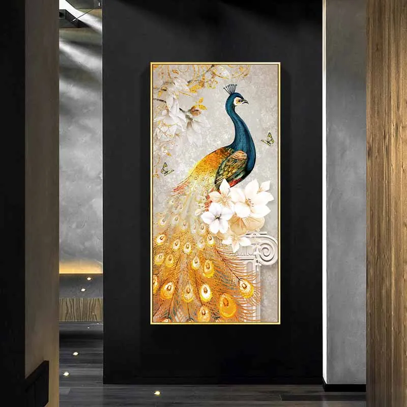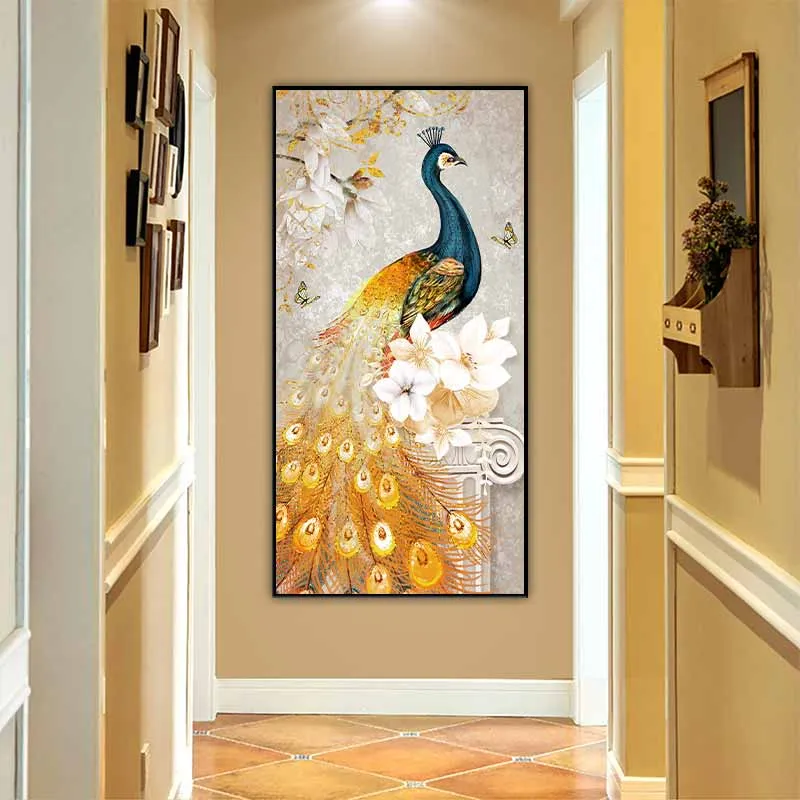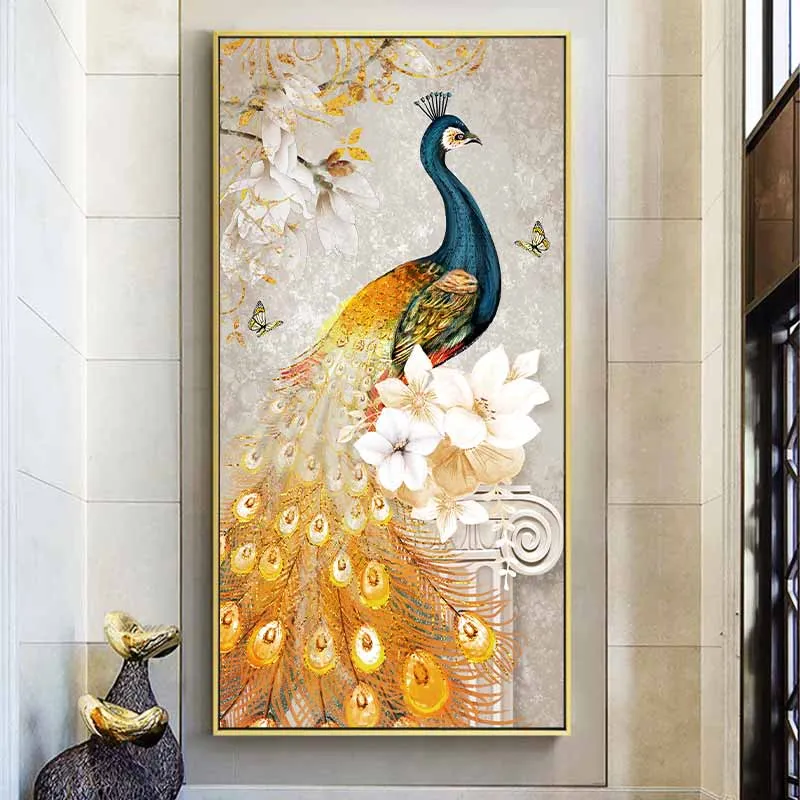 Tranh chim công xanh đuôi vàng và bông hoa màu trắng
