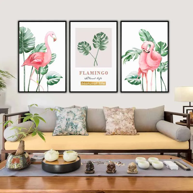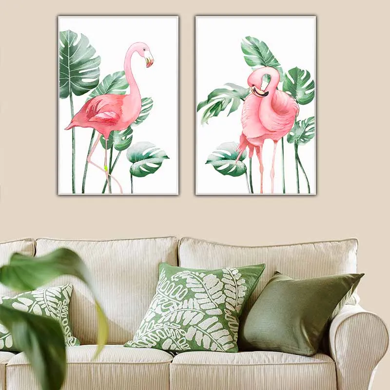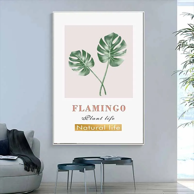Tranh chim hồng hạc và lá cây nhiệt đới lá trầu bà lá Monstera
