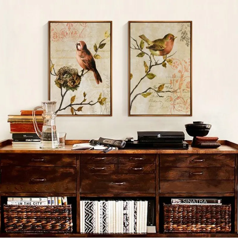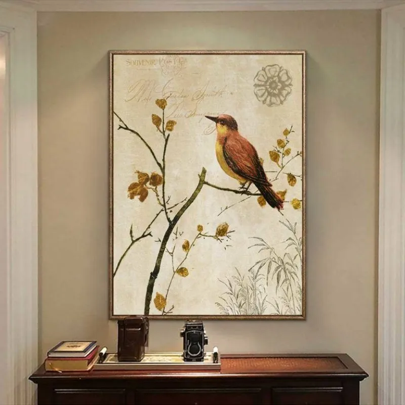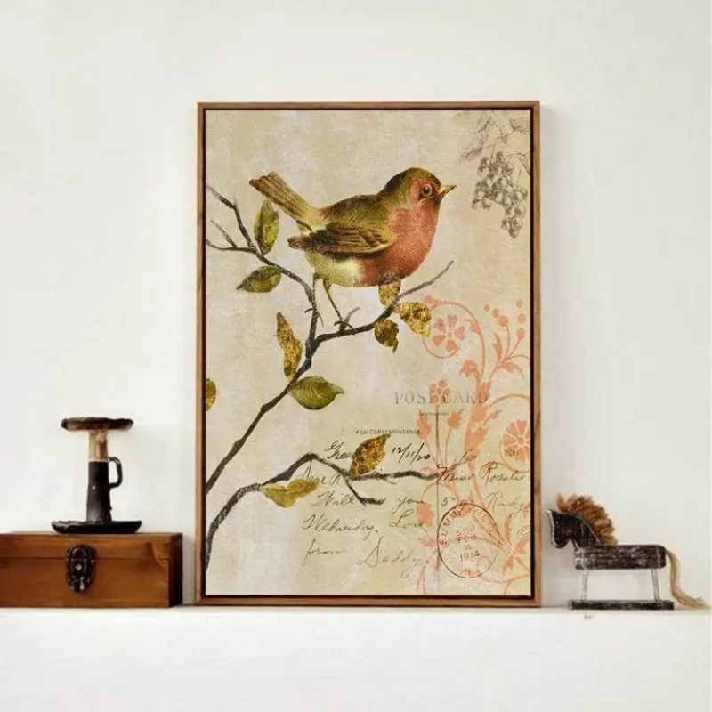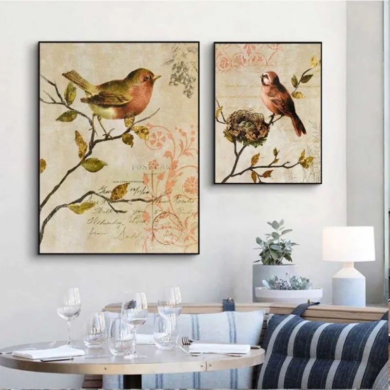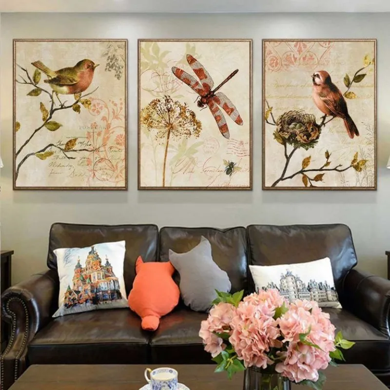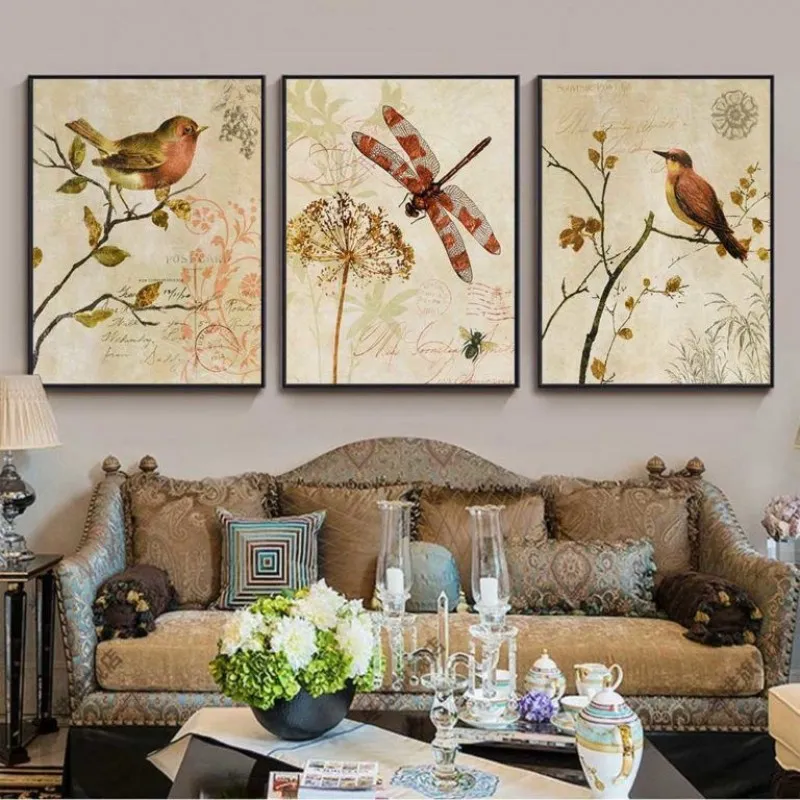 Tranh in canvas chim, chuồn chuồn và ong. Màu sắc cổ điển theo phong cách Vintage.