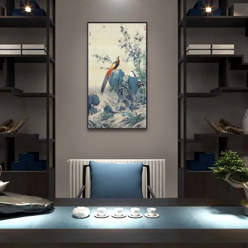 - Kết hợp với ánh sáng: Bức tranh với nhiều chi tiết và màu sắc cần ánh sáng phù hợp. Ánh sáng chiếu điểm (spotlight) sẽ giúp làm nổi bật vẻ đẹp của tác phẩm, đặc biệt là các chi tiết vàng, đỏ của chim và xanh của cây lá.