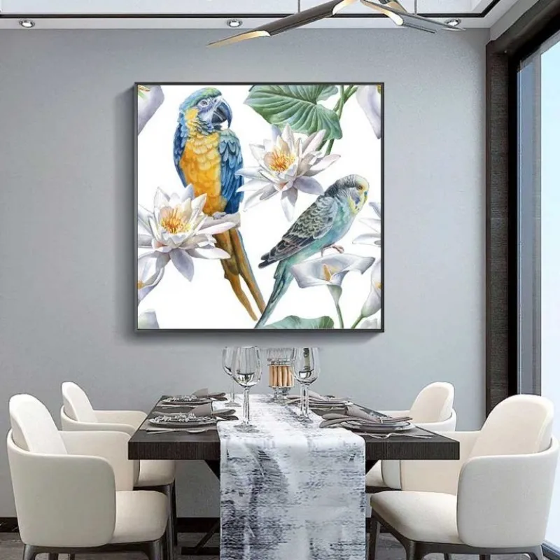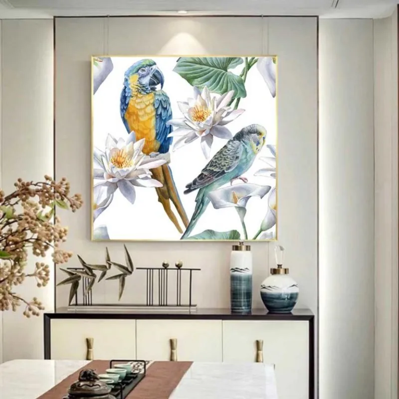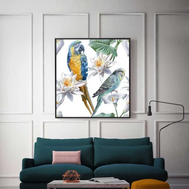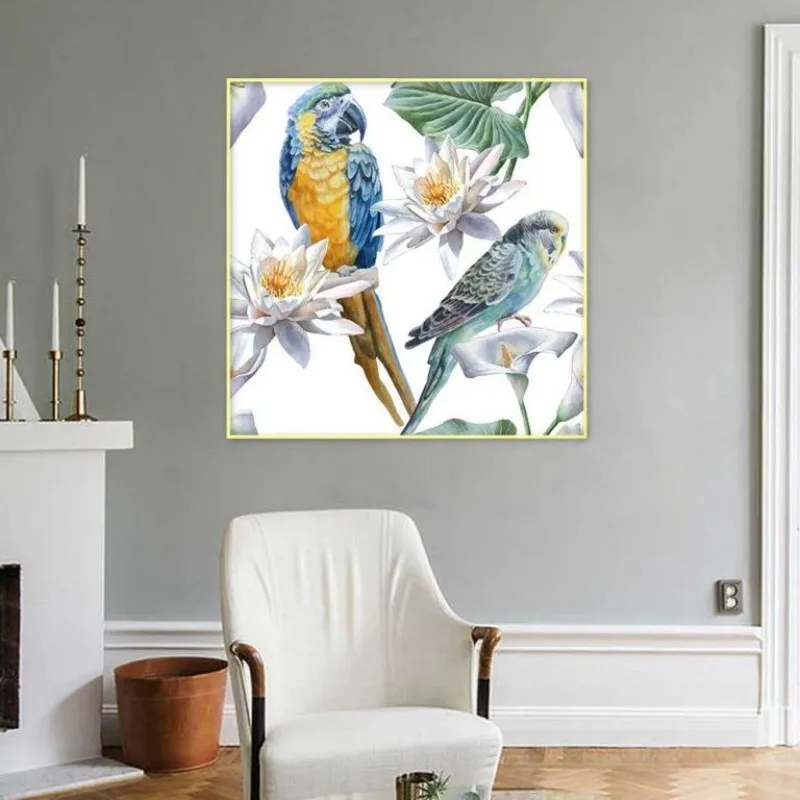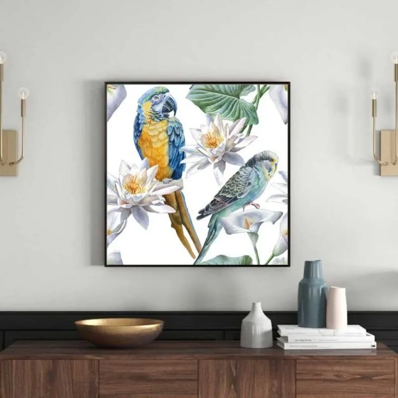 Tranh in canvas chim vẹt, két cùng hoa sen trắng và hoa ly.