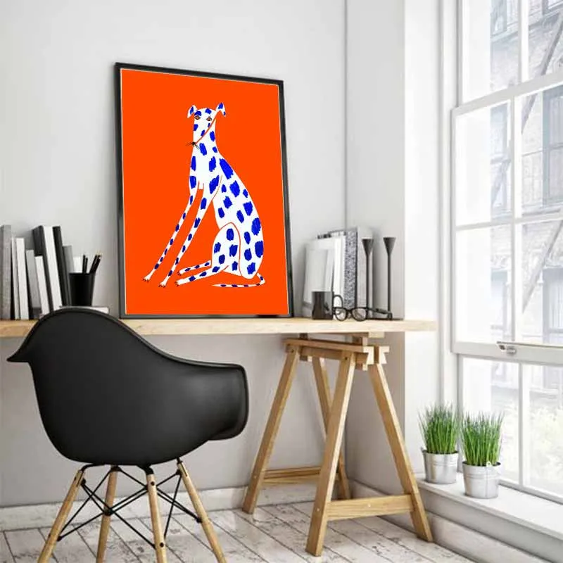 Bức tranh in canvas với hình ảnh chú chó đốm xanh nổi bật trên nền cam rực rỡ. Bức tranh mang phong cách hiện đại, tối giản nhưng vẫn toát lên vẻ đáng yêu và tinh nghịch của chú chó. Màu sắc tươi sáng và bố cục đơn giản giúp bức tranh phù hợp với nhiều không gian nội thất khác nhau, từ phòng khách, phòng ngủ đến phòng làm việc.