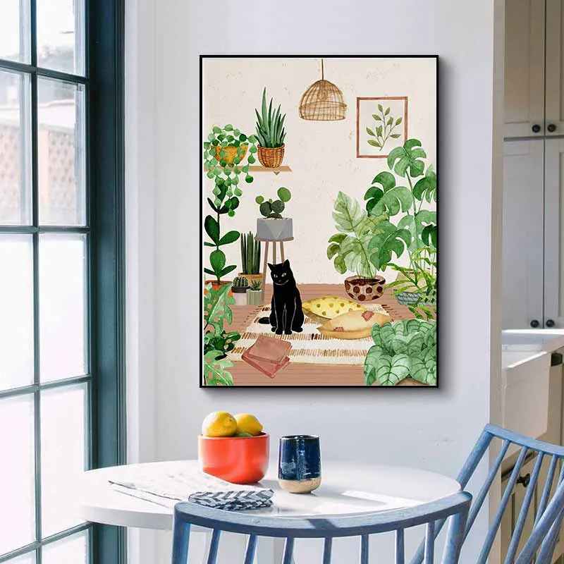 Tranh chú mèo đen đang ngồi, xung quanh có nhiều cây nhiệt đới