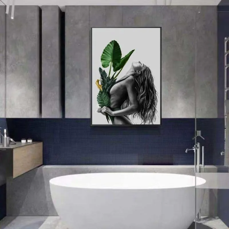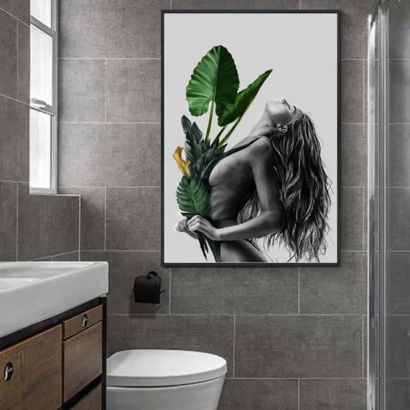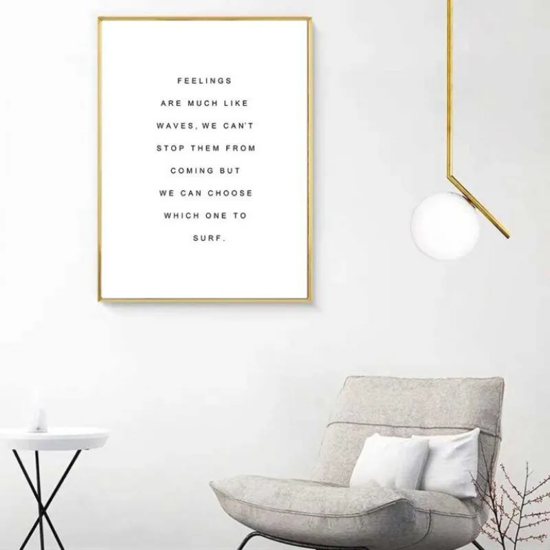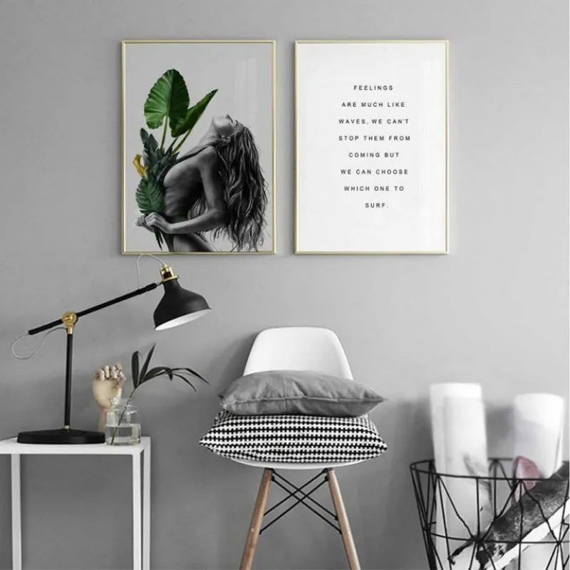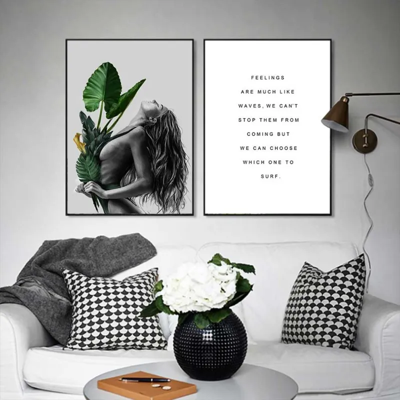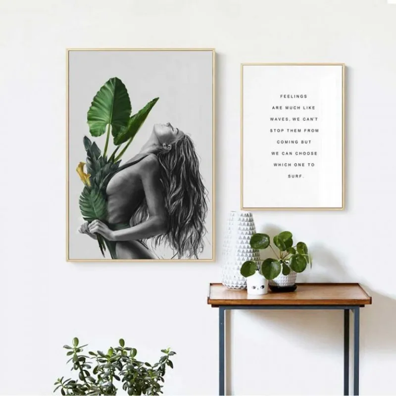 Tranh in canvas cô gái tay cầm những chiếc lá cây nhiệt đới kết hợp chữ feelings are much like waves, we can’t stop them from coming but we can choose which one to surf.