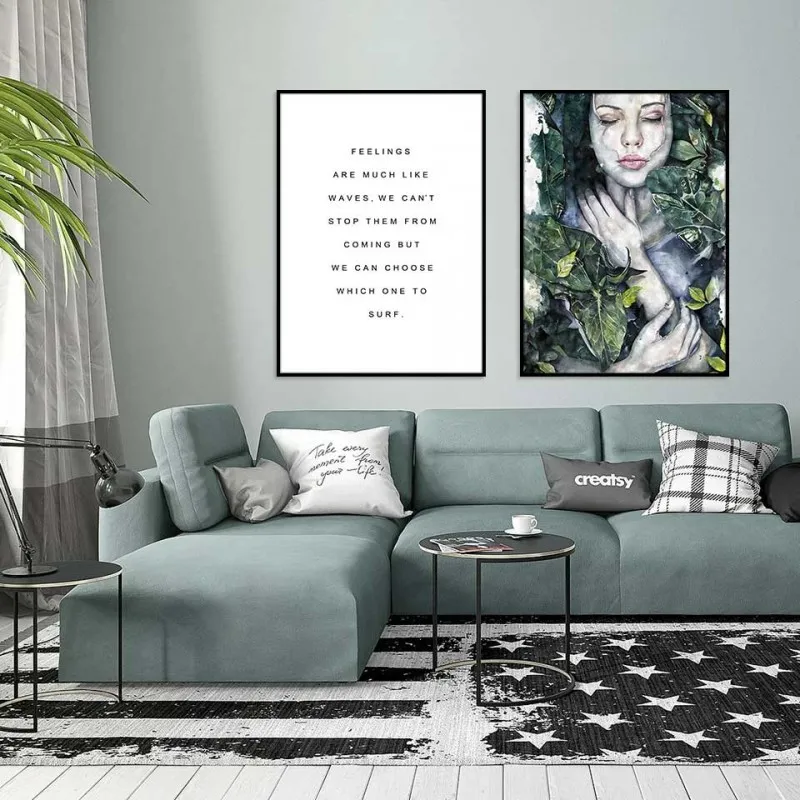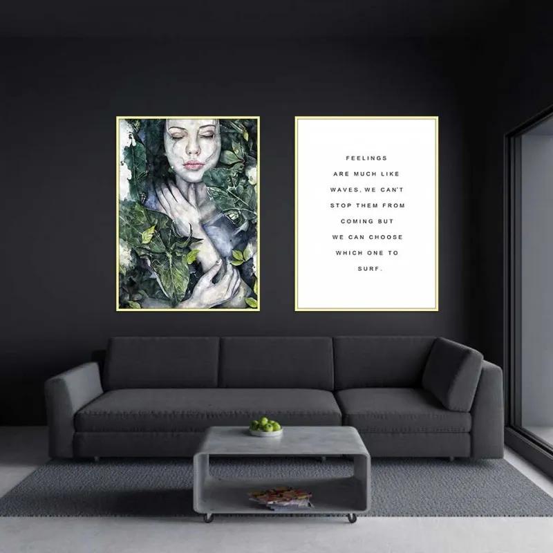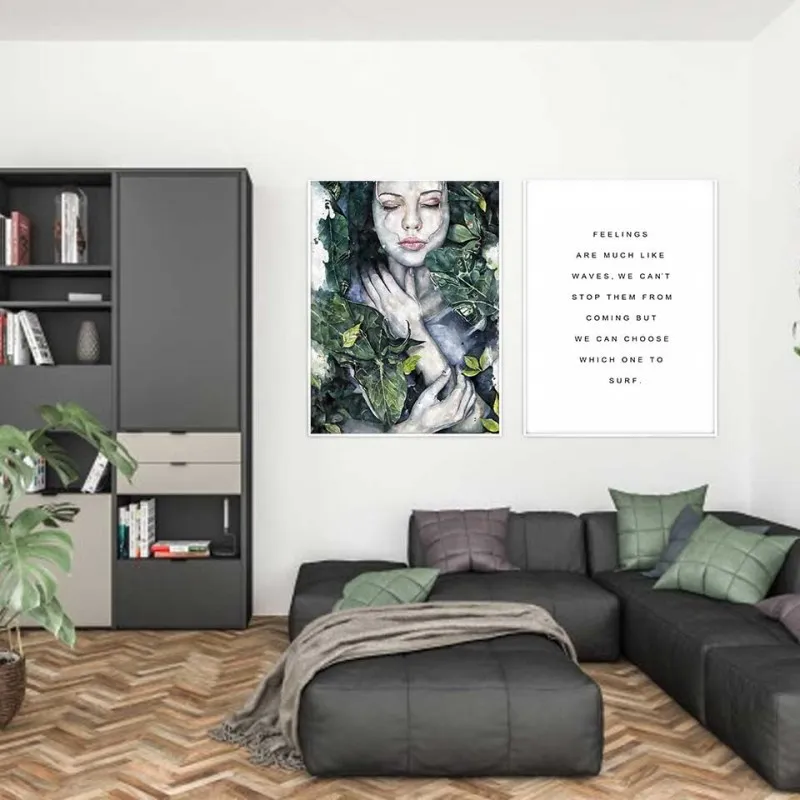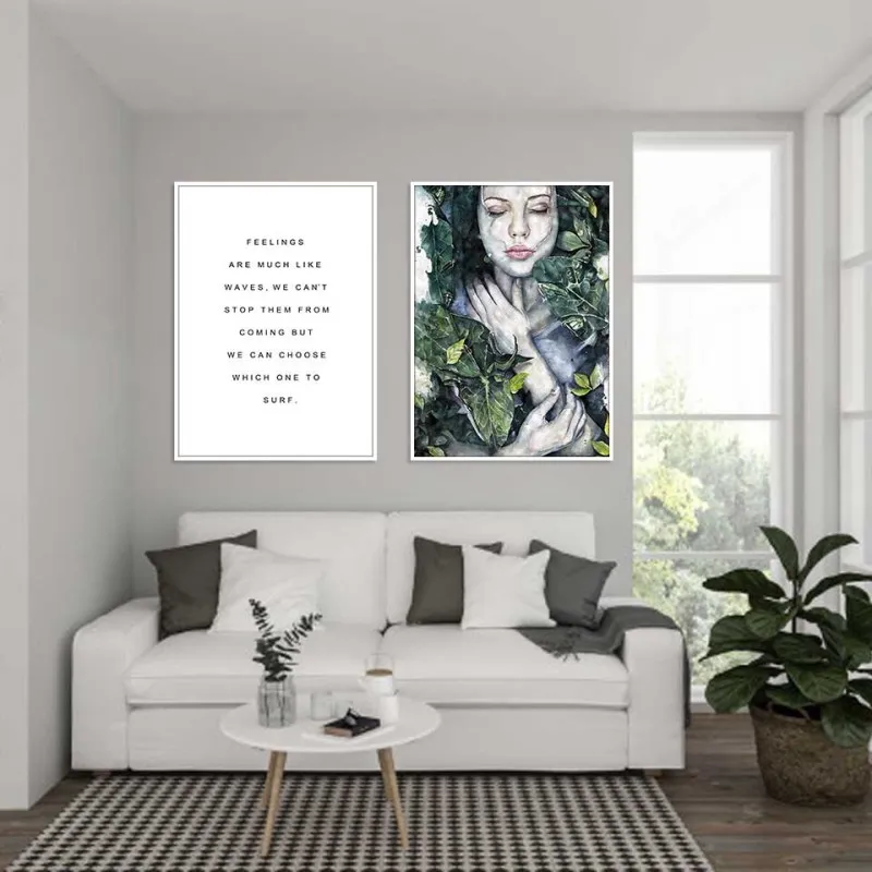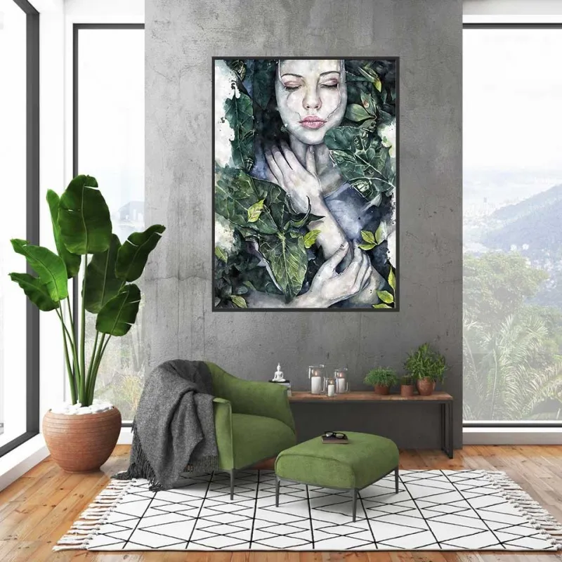 Tranh cô gái quấn lá cây xanh kết hợp với chữ
