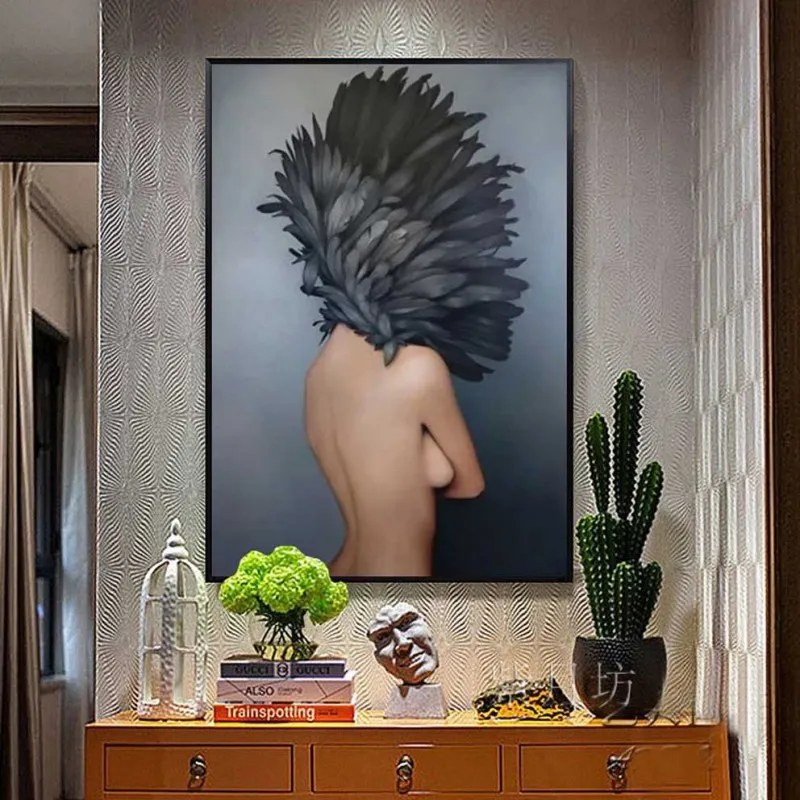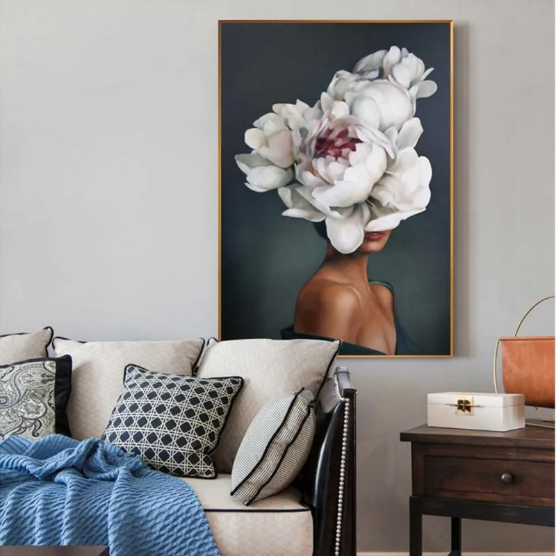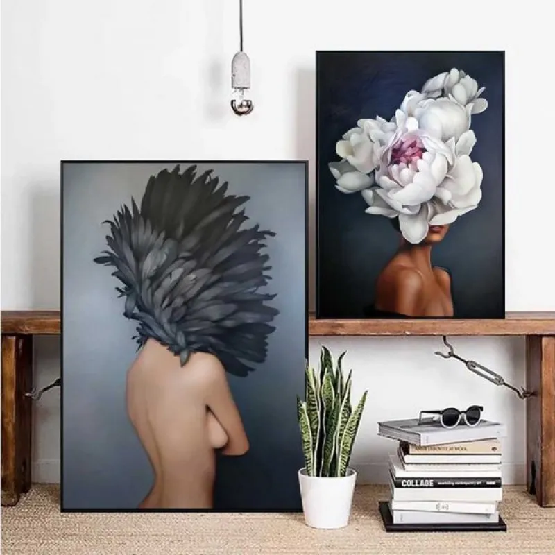 Tranh bán khỏa thân cô gái với chiếc mũ lông và cô gái cùng với bông hoa trắng to che hầu như toàn bộ khuôn mặt cùng với 2 sắc màu đối lập đen và trắng sẽ làm cho không gian luôn có sự cạnh tranh, giúp cho văn phòng không còn sự nhàm chán.