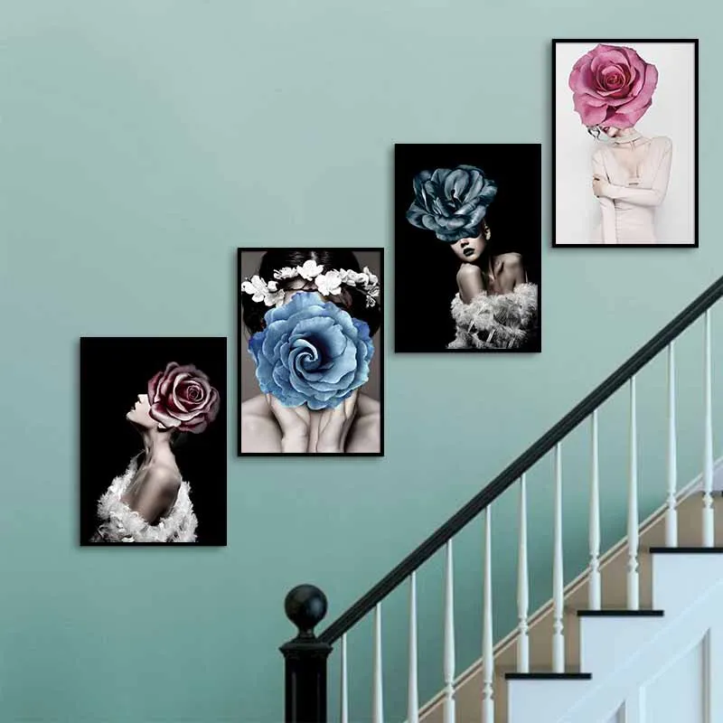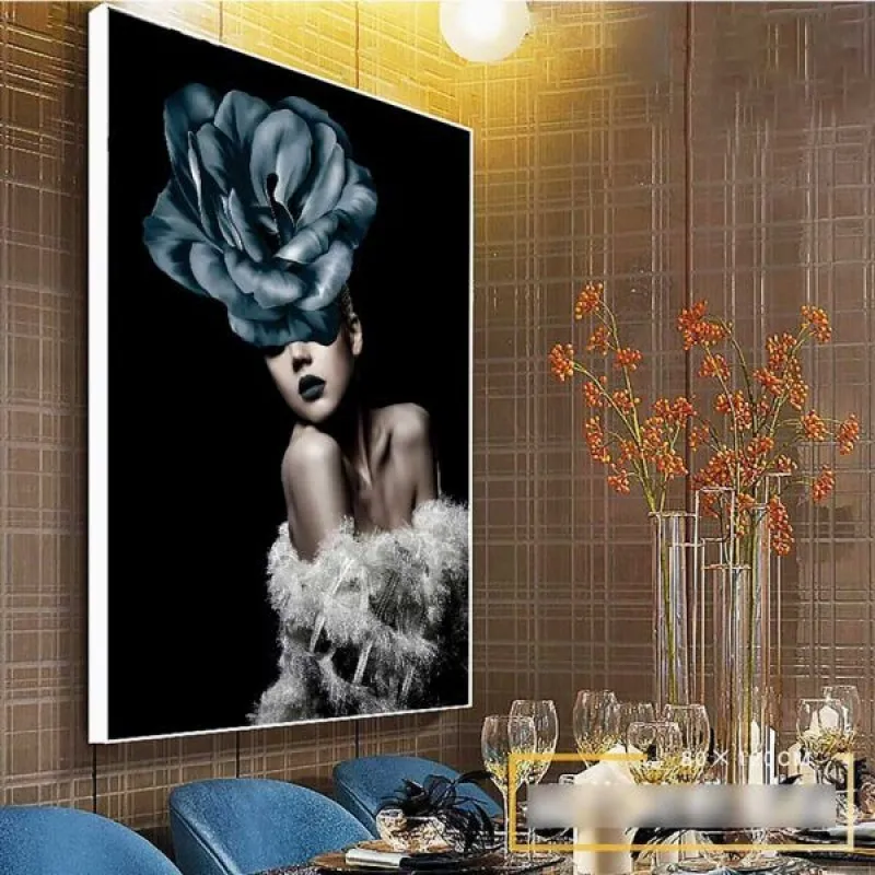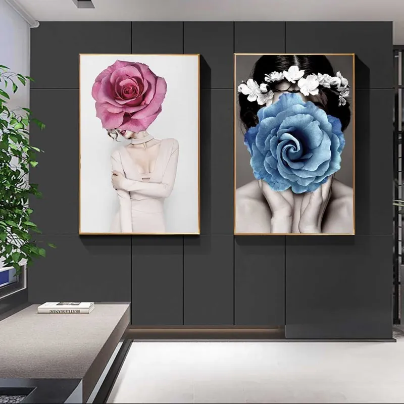 Tranh cô gái với những bông hoa lớn che gần hết khuôn mặt luôn cảm cho người xem có cảm giá tò mò về khuôn mặt thật sự của những mỹ nhân này, bộ tranh trừu tượng khá được yêu thích.