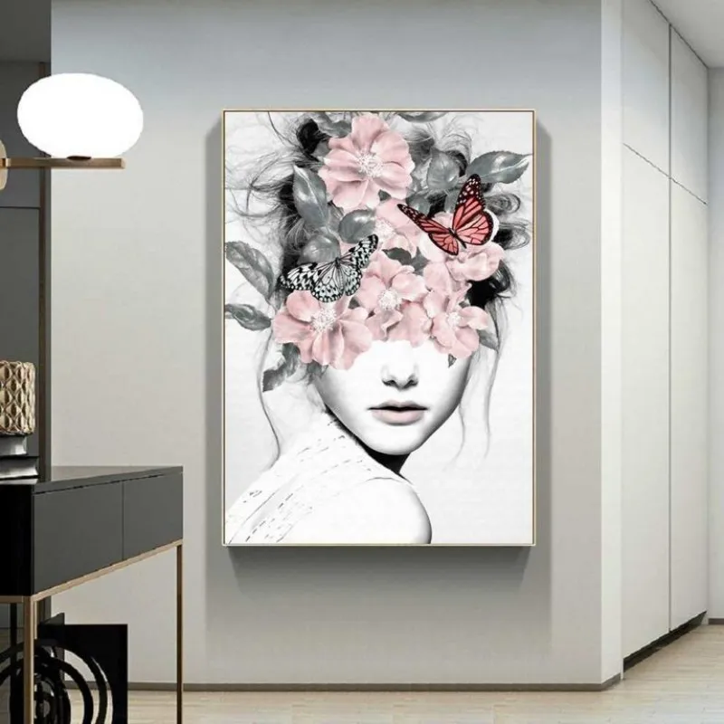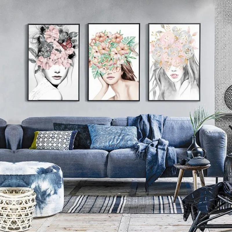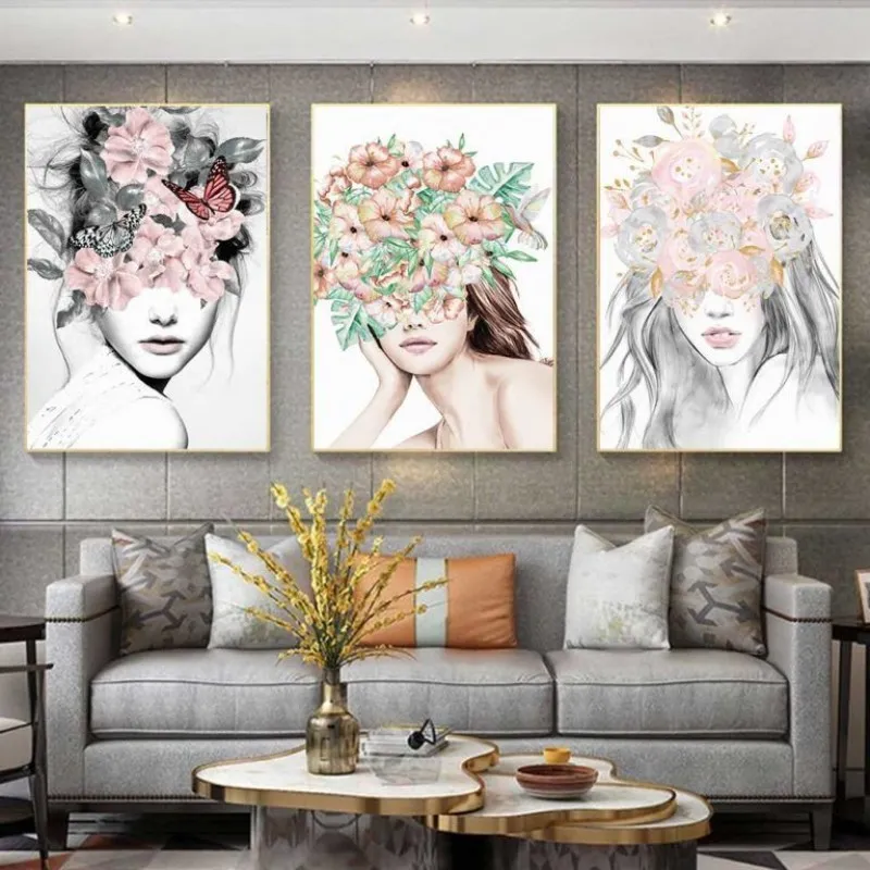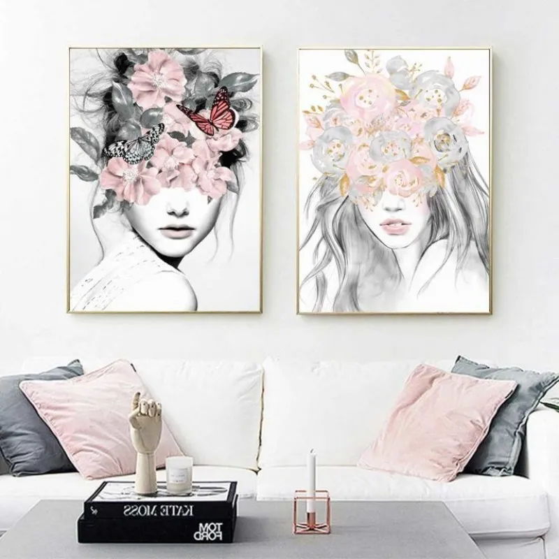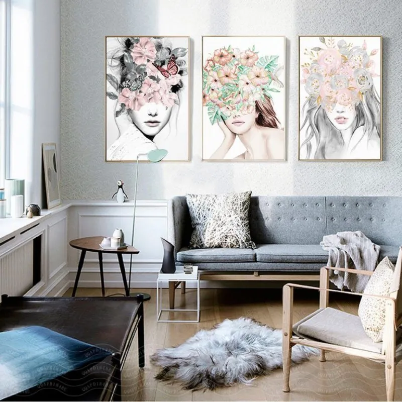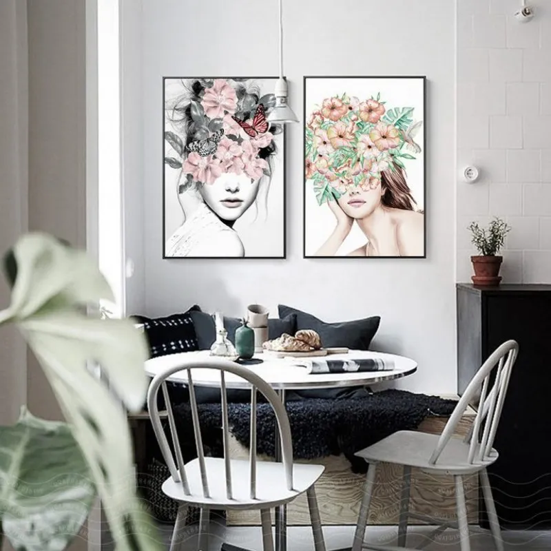 Tranh in canvas cô gái với bó hoa che đi một phần khuôn mặt của các cô gái, tạo sự tò mò và hứng thúđể khám phá cho người xem, màu sắc nhẹ nhàng trẻ trung.