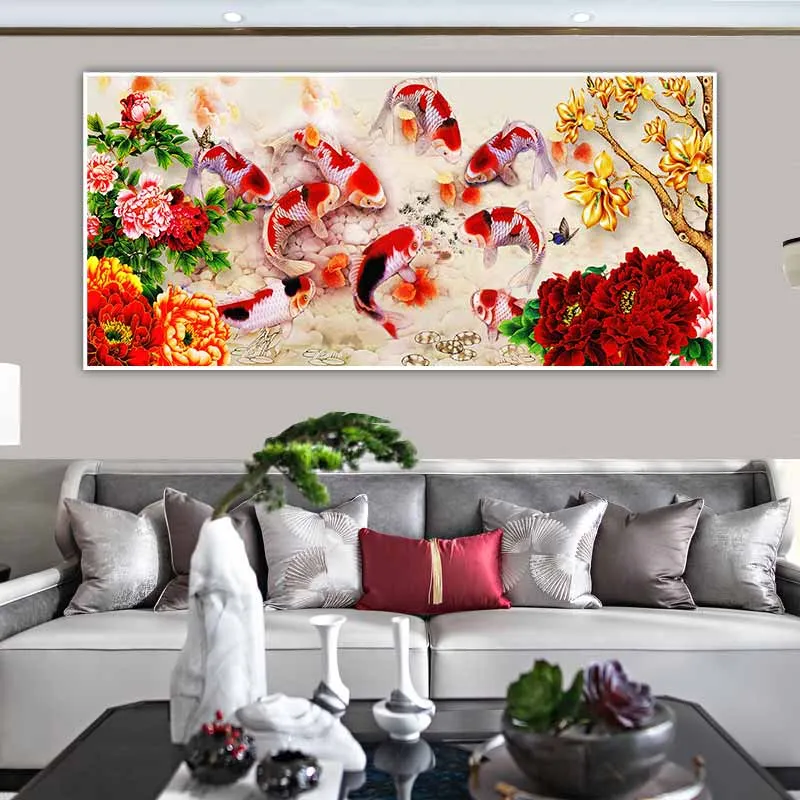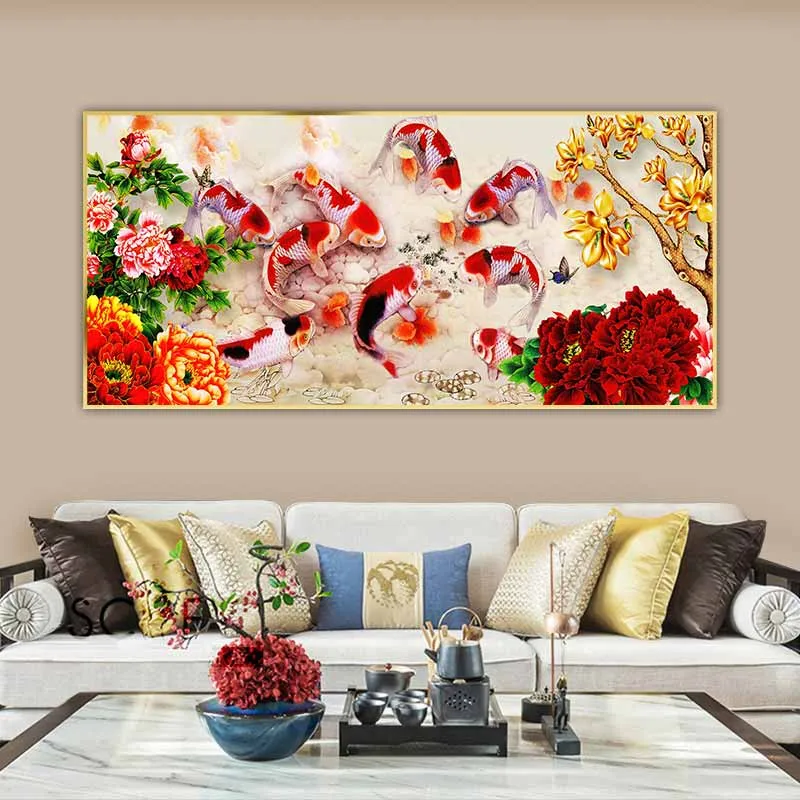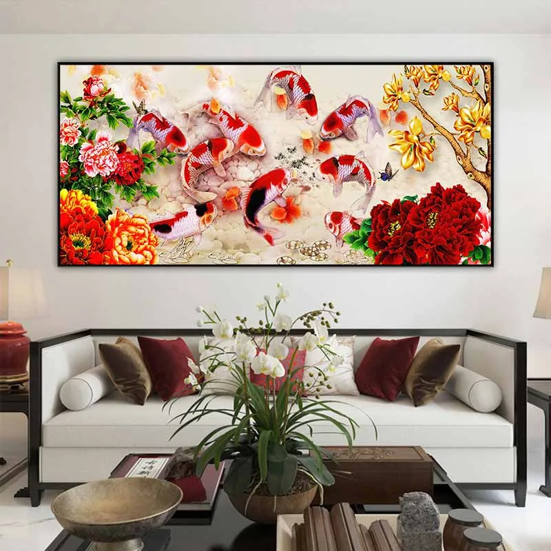 Tranh cửu ngư quần thực, 9 con cá chép và hoa mẫu đơn