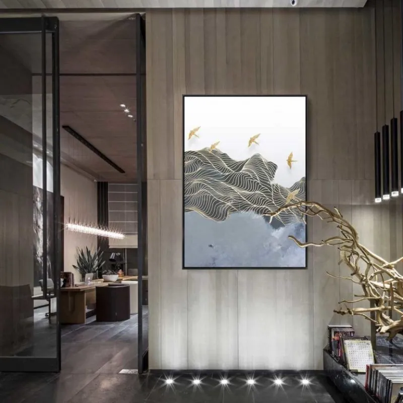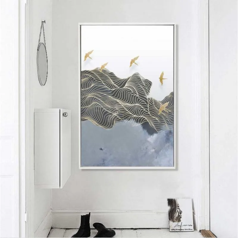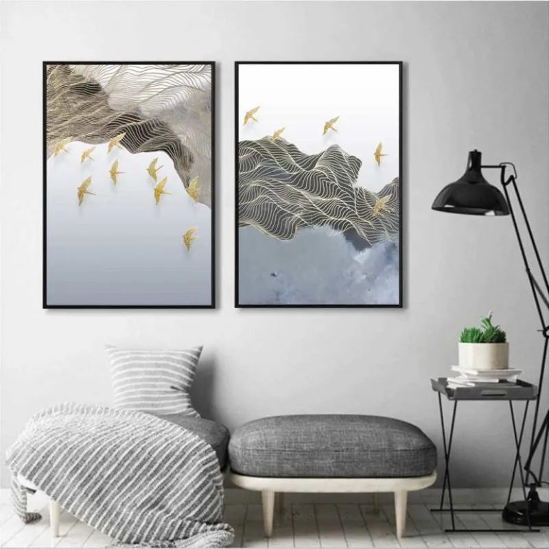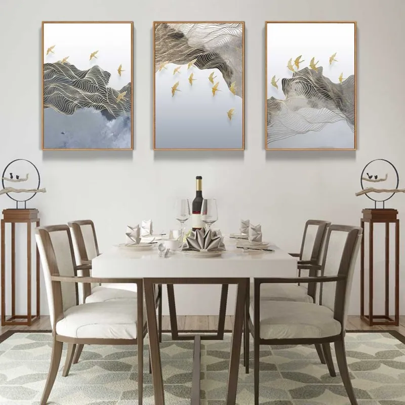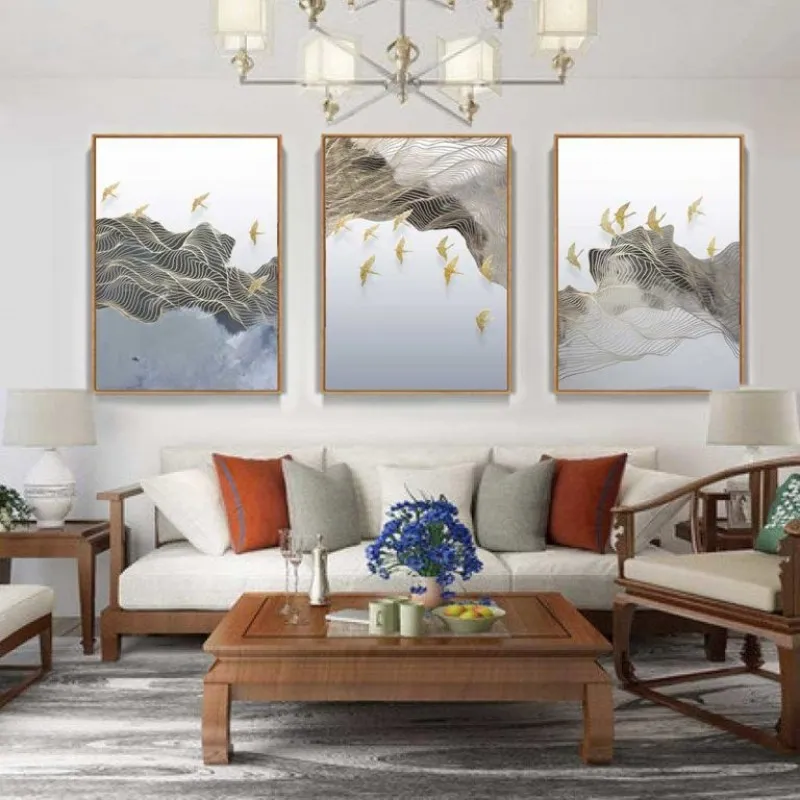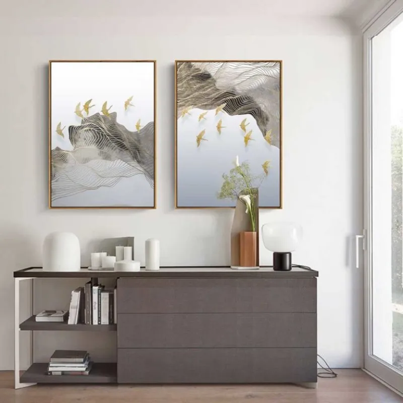 Tranh đàn chim bay qua các ngọn núi trừu tượng