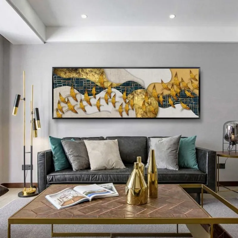 Tranh đàn chim bay trên những ngọn núi vàng trừu tượng